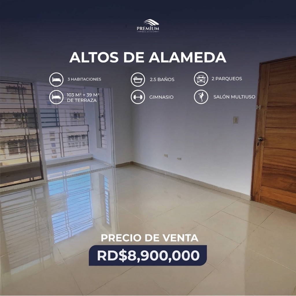 Altos de Alameda, SDO 4to nivel con Terraza privada (40mts) 3 Habitaciones -2.5 baños -2 Parqueos paralelos -Balcón -Gas común -Cuarto de servicio -Hab. Principal con baño y Walk-in closet -Terraza techada y destechada con baño -Hierros en puertas y ventanas. -Proyecto cerrado -Casa Club -Gazebo -Cancha de basket - Salón de juegos de mesa -Area de juegos infantiles -Salon multiuso -Gimnasio full equipado -Terraza común amueblada Precio: RD$ 8,900,000