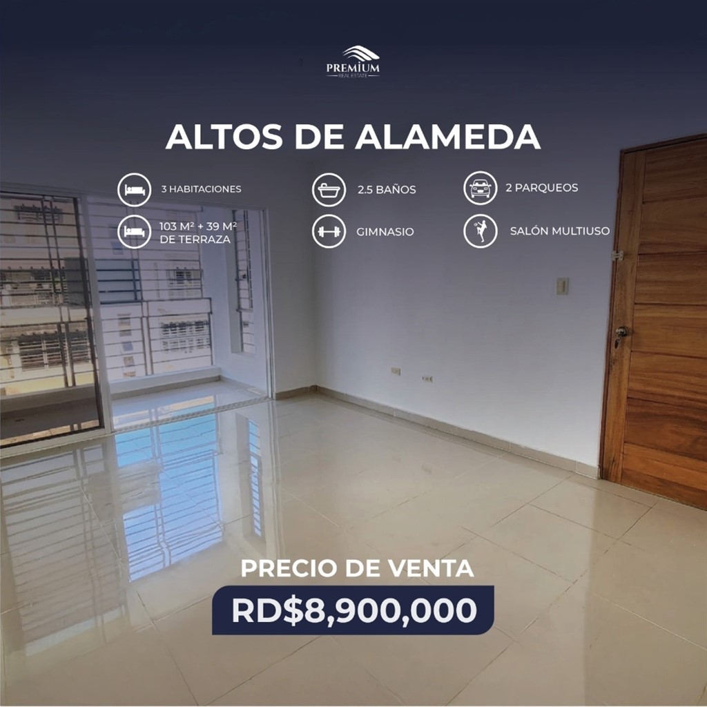 Altos de Alameda, SDO 4to nivel con Terraza 103 mts + 39 de terraza 3 Habitaciones -2.5 baños -2 Parqueos paralelos -Balcón -Gas común -Cuarto de servicio -Hab. Principal con baño y Walk-in closet -Terraza techada y destechada con baño -Hierros en puertas y ventanas. -Proyecto cerrado -Casa Club -Cancha de basket - Salón de juegos -Salon multiuso -Gimnasio -Terraza común amueblada Precio: RD$ 8,900,000.