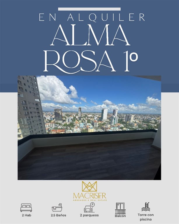 Alquiler Exclusivo en Alma Rosa I Apartamento ubicado en una de las torres más exclusivas de Alma Rosa Primera, ideal para quienes buscan confort, estilo y excelente ubicación. Distribución: 2 Habitaciones 2.5 Baños Cocina de concepto abierto Sala / Comedor Balcón Área de lavado Cuarto de servicio 2 Parqueos Área social: Piscina Gimnasio Piso 19 Precio de alquiler: US$ 1,400 Vive con comodidad y exclusividad en un entorno moderno y seguro. Contáctame para más información o coordinar tu visita.