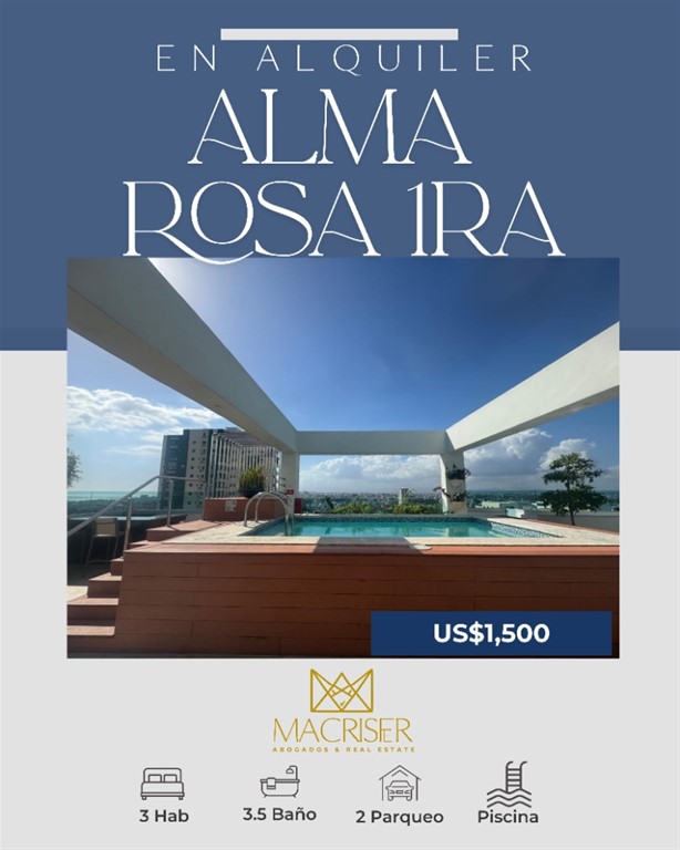 Apartamento en Alquiler | Alma Rosa Primera Vive en un Merlot: elegante, equilibrado y con carácter. 3 Habitaciones, cada una con su baño y clóset Doble cocina: fría y caliente 4.5 Baños Sala y comedor amplios Family room Balcón súper amplio Piso 4 Ascensor de última generación 2 Parqueos Seguridad 24/7 Área social: Gimnasio Salón de eventos Piscina Precio de alquiler: US$ 1,500 Un espacio para quienes saben vivir bien. Contáctame y agenda tu visita