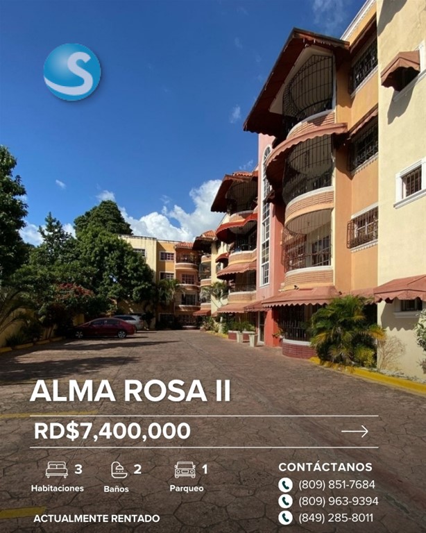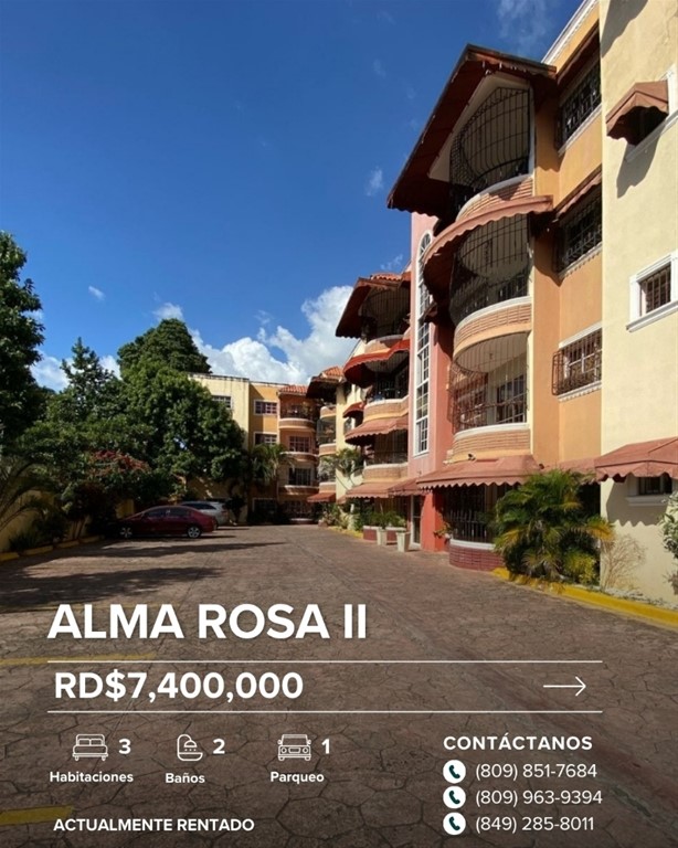 Residencial Karla ?? Alma Rosa II ?? RD$7.4M (negociable) ?? 3er Nivel - 141.80 mts² ? CARACTERÍSTICAS: ??? Balcón ??? Sala ??? Comedor ?? Cocina equipada ??? 3 Habitaciones ?? 2 Baños ??? Cuarto de Servicio con baño ?? 1 Parqueo ?? Seguridad: ?? Portón eléctrico ?? Vigilante ?? Cisterna con bomba
