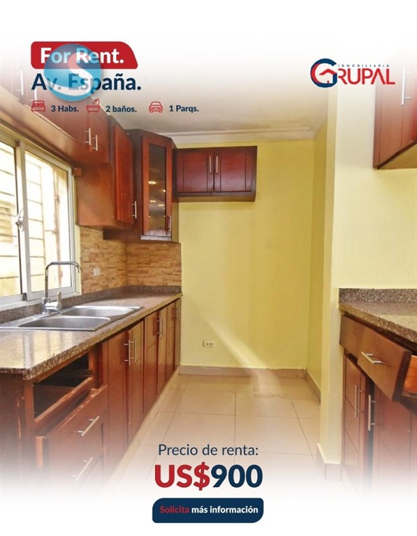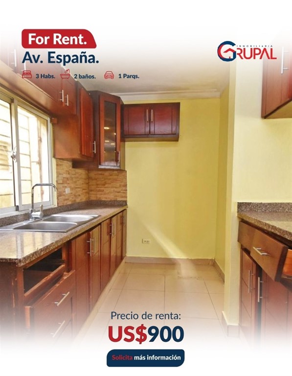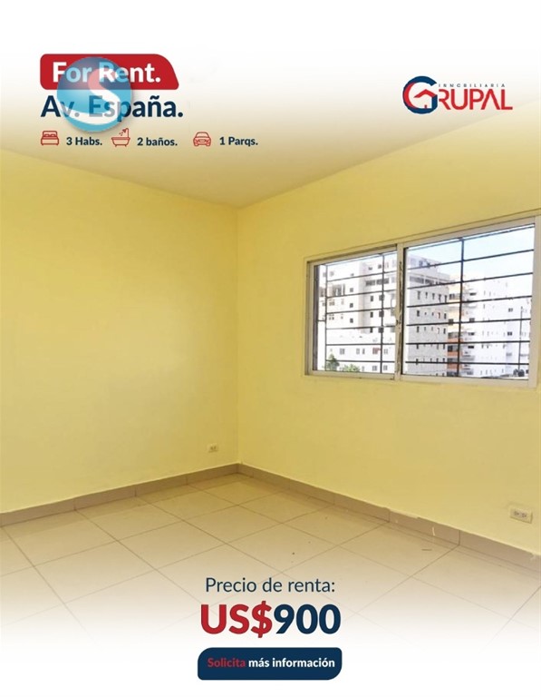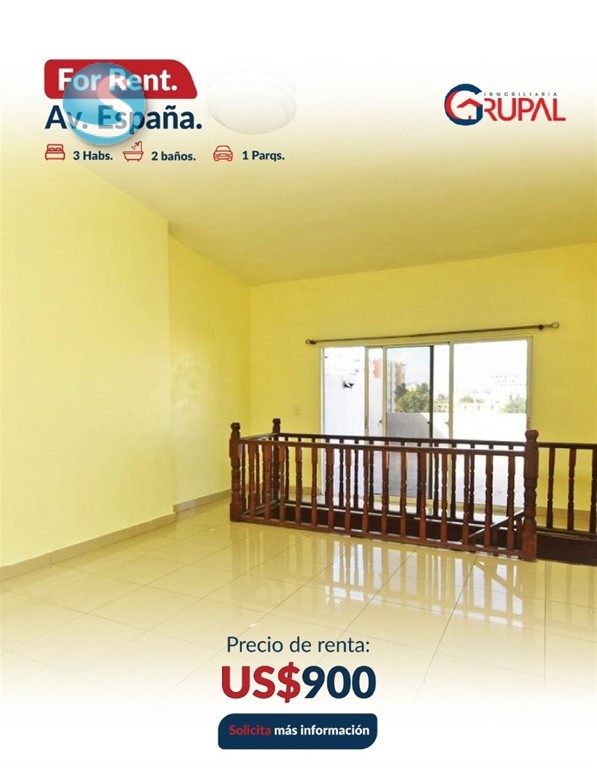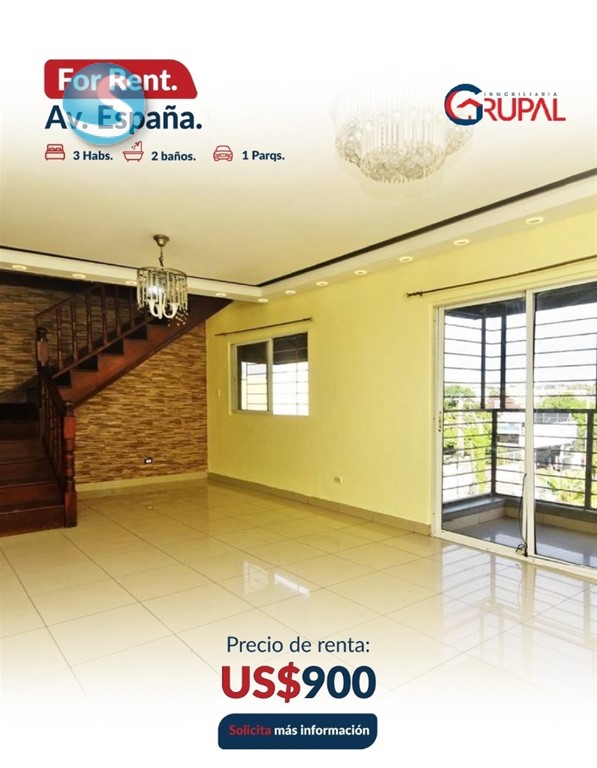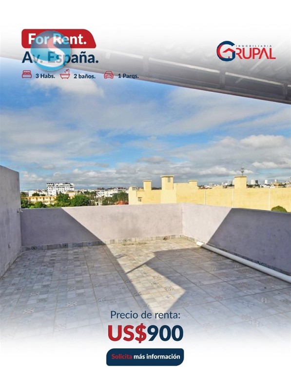 Apartamento en Renta – Avenida España Características del apartamento - Nivel: 4to y 5to piso (dos niveles) - Tipo Penthouse - Edificio sin ascensor - 3 habitaciones - 2 baños - Sala – comedor - Cocina - Estar familiar - Cuarto de servicio - Terraza destechada - 1 parqueo Precio de alquiler US$900 Información: (849)506-5220 también disponible en WhatsApp Gianela Santana