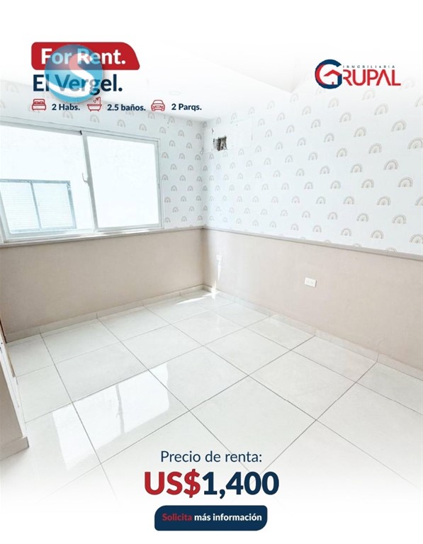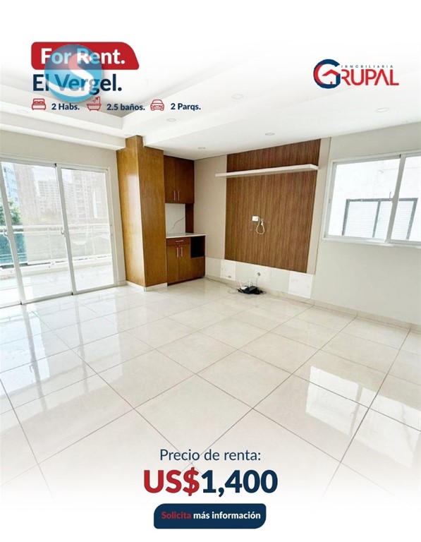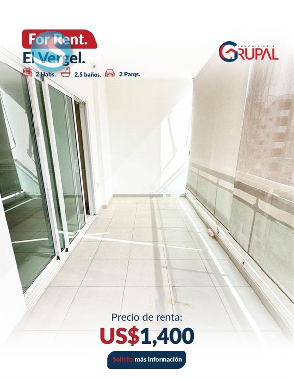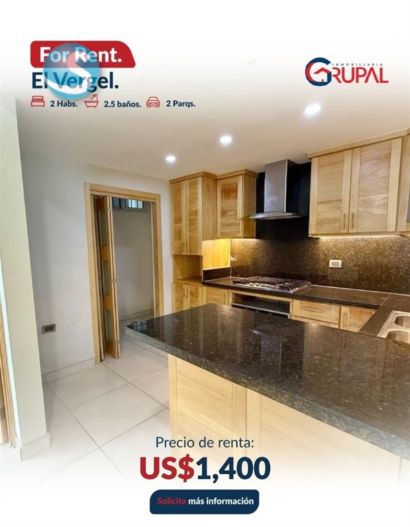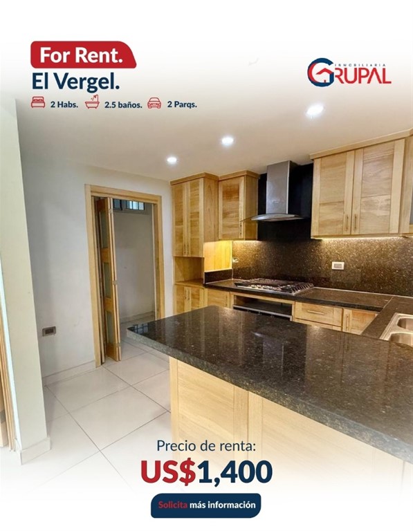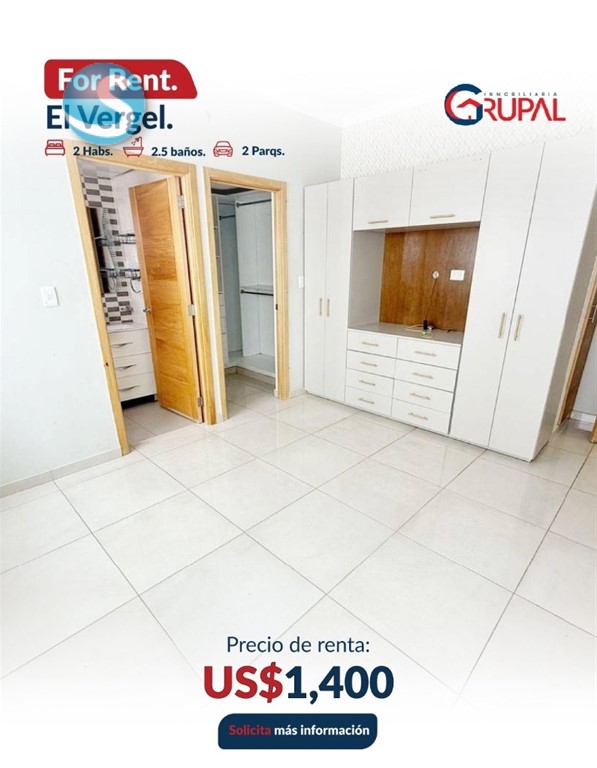 Apartamento en Alquiler – El Vergel Características del Apartamento: - 2 habitaciones, cada una con baño y walk-in closet (Principal con Closet Modular + Aire acondicionado) - Medio baño para visitas - Balcón tipo terraza - Sala – comedor - Cocina con desayunador - Área de lavado y cuarto de servicio con baño - 2 parqueos paralelos, techados - Bar empotrado + muebles multifuncionales, mueble para TV, estufa. horno y extractor incluidos - Sistema de seguridad inteligente con alarmas - Sistema de Cámaras de Seguridad Características de la torre: - Gimnasio - Terraza doble - Lobby amueblado Precio de alquiler US$1,400 Información: (849) 506-5220