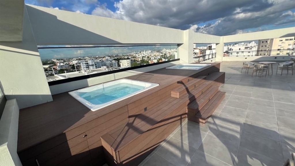 2 habitaciones con su baño más medio baño de visita y un parqueo techado Cuarto de servicio con baño Características Generales • Lobby de entrada amueblado • Área social tipo Rooftop techada y destechada con 2 jacuzzi y bbq. • Área infantil • Gimnasio • Salón Lounge • Working Space • Ascensor de última generación • Planta full • Sistema de cámaras de seguridad • Pozo tubular • Gas común • Control de acceso • Sistema contra incendio Terminaciones • Pisos en porcelanato • Cocinas modulares con desayunador • Tope de cocina en granito con backsplash • Puertas y closets en madera preciosa • Grifería importada • Muebles de baños • Pre-instalación de aires acondicionados en habitaciones • Calentadores de gas Precio No Negociable Incluye Mantenimiento