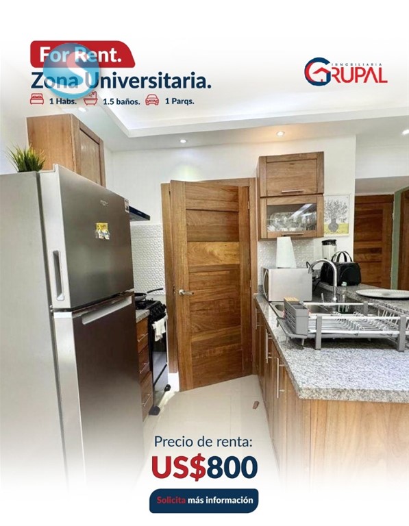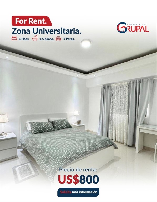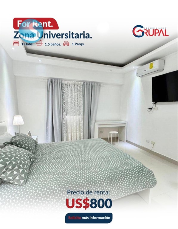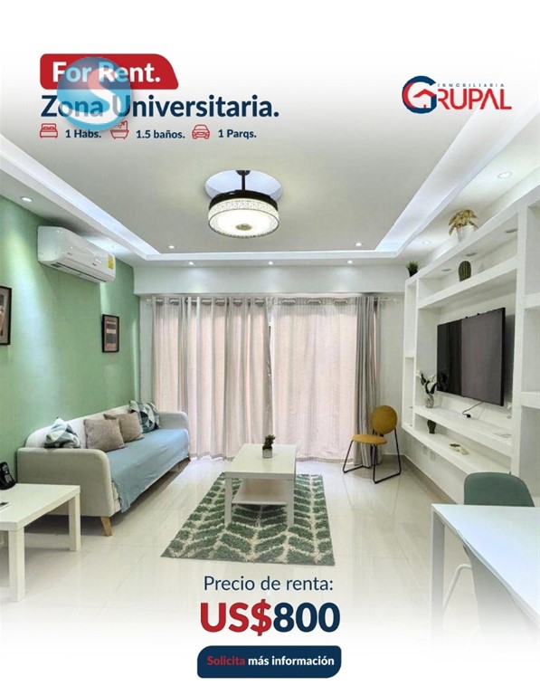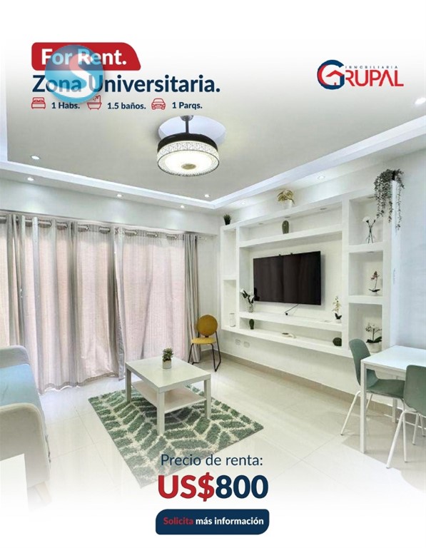 Alquiler apartamento amueblado en Zona Universitaria. Ubicado en piso alto, ideal para estudiantes, ejecutivos jóvenes o profesionales que buscan comodidad y ubicación estratégica. Características del apartamento: • Piso alto • 1 habitación • 1.5 baños • Sala • Comedor • Cocina • Área de lavado • 1 parqueo Amenidades de la torre: • 4 ascensores de última generación • Lobby de gran altura climatizado • Gas común • Planta eléctrica • Seguridad 24/7 • Gimnasio • Salón para eventos • Área de niños Precio de alquiler: US$800 Mantenimiento incluido Gianela Santana Agente Inmobiliario 849-506-5220