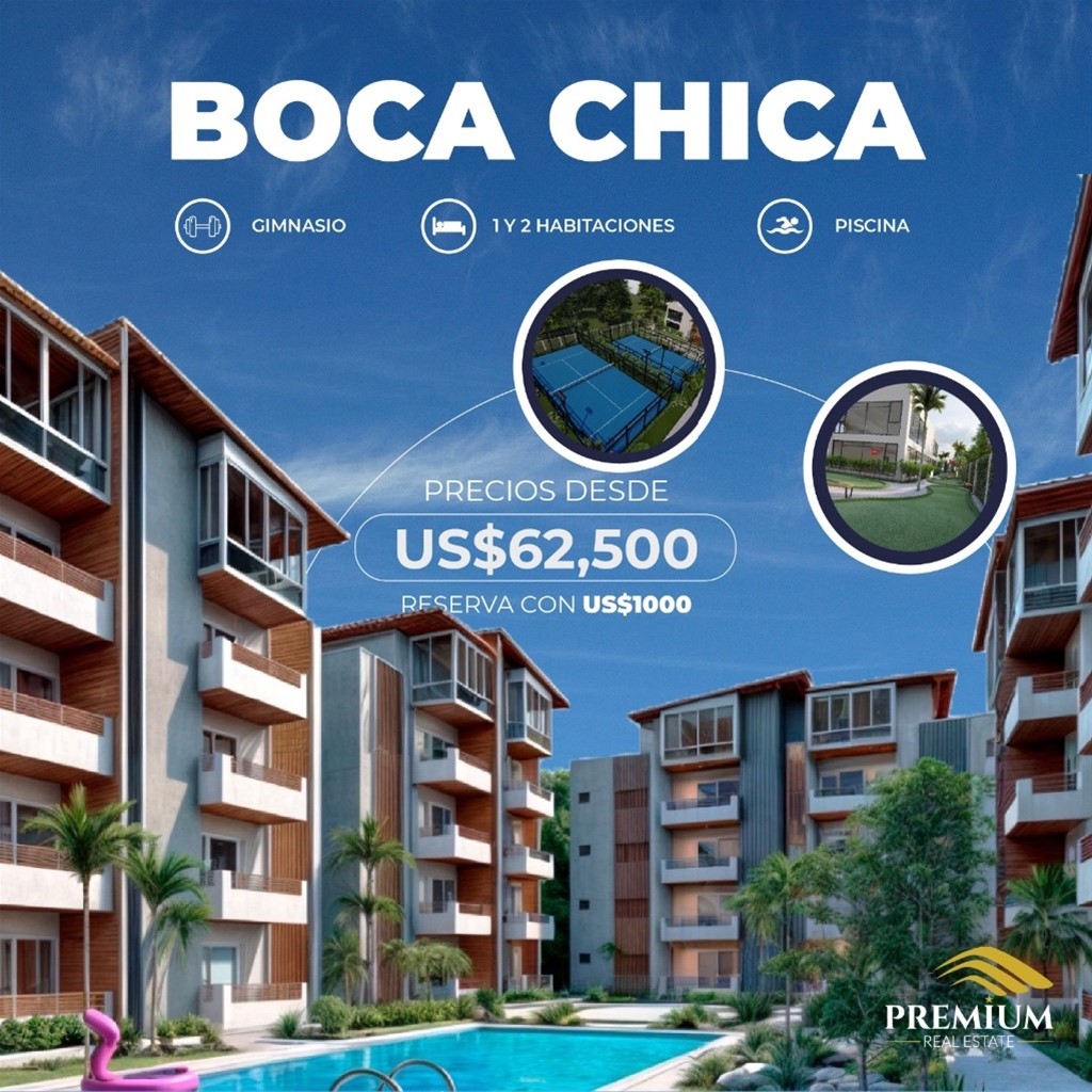 Boca Chica ?? Apartamentos de 1 y 2 habitaciones Patio/terraza Doble balcón Elegantes y modernos acabados Amenidades tales como: A solo 3 minutos de la Playa de Boca Chica ??? Club de playa Casa club privada Cancha de tenis ?? Cancha de baloncesto ?? Gimnasio ?????? Áreas verdes ?? Piscinas ?? Seguridad 24/7 ????? Reserva tu unidad con tan solo US$1,000 ?? Precios desde: US$62,500??