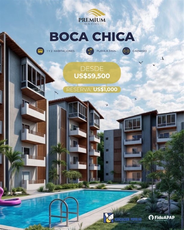 BOCA CHICA Reserva tu unidad con tan solo US$1,000 Precios desde: US$59,500 Apartamentos tipo condo hotel de 1 y 2 habitaciones. Elegantes y modernos acabados. Amenidades tales como: A solo 3 minutos de la Playa de Boca Chica Club de playa Casa club privada Cancha de tenis Cancha de baloncesto Piscinas Gimnasio Áreas verdes Seguridad 24/7 y acceso a las mejores playas de Boca Chica ¡No pierdas esta oportunidad única! Entrega en 24 meses Con garantía Fiduciaria.
