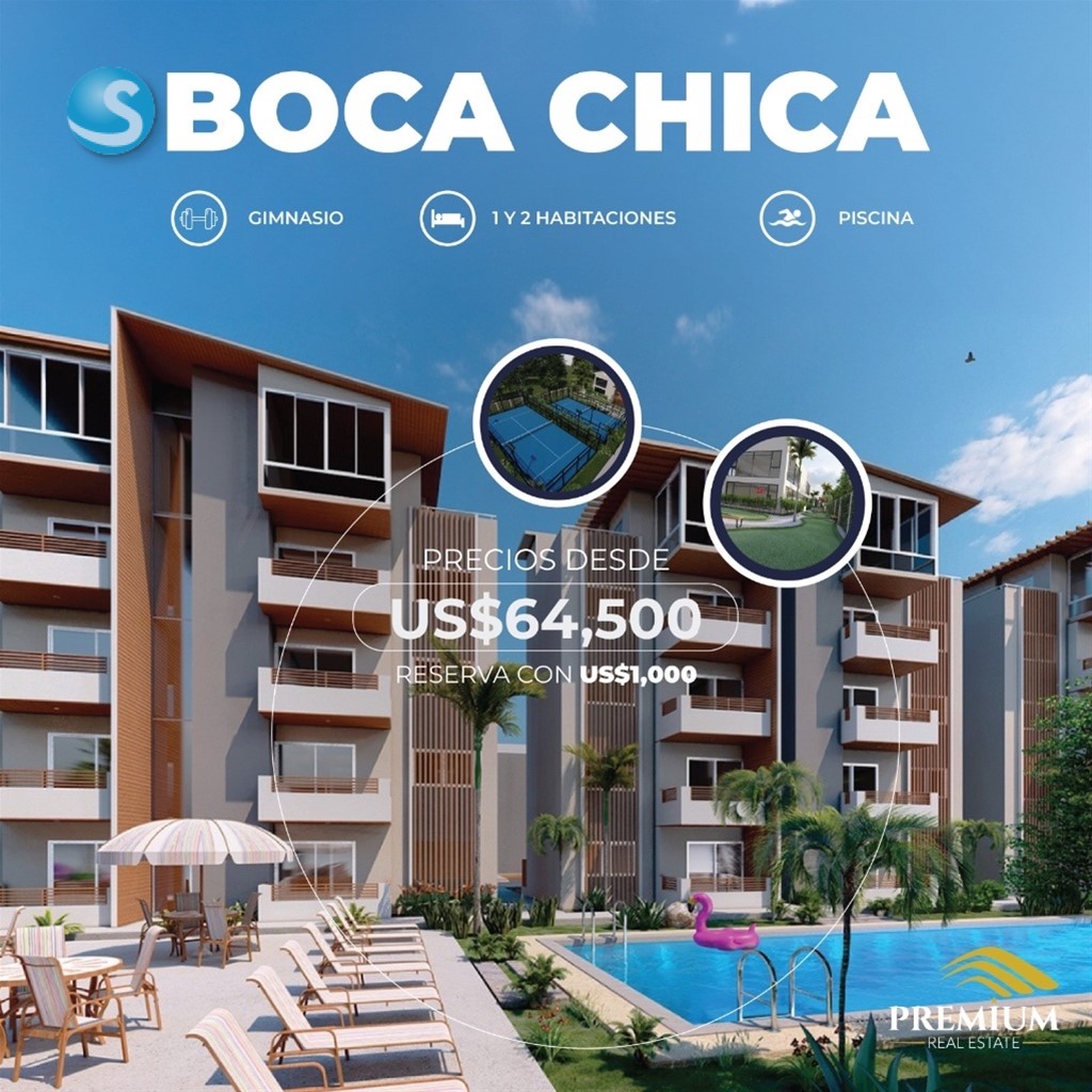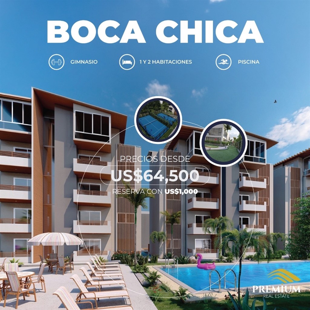 Boca Chica ??Proyecto en construcción, a tan solo 3 minutos de la playa. Apartamentos de 1 y 2 habitaciones. Doble balcón. Elegantes y modernos acabados. Unidades con patio y terraza disponibles. Amenidades: Ascensor Club de playa Casa club privada Cancha de tenis ?? Cancha de baloncesto ?? Gimnasio ?????? Áreas verdes ?? Piscinas ?? Seguridad 24/7 ????? Reserva: US$1,000 Precios desde: US$64,500?? • ¡Consulta nuestros planes de pagos!