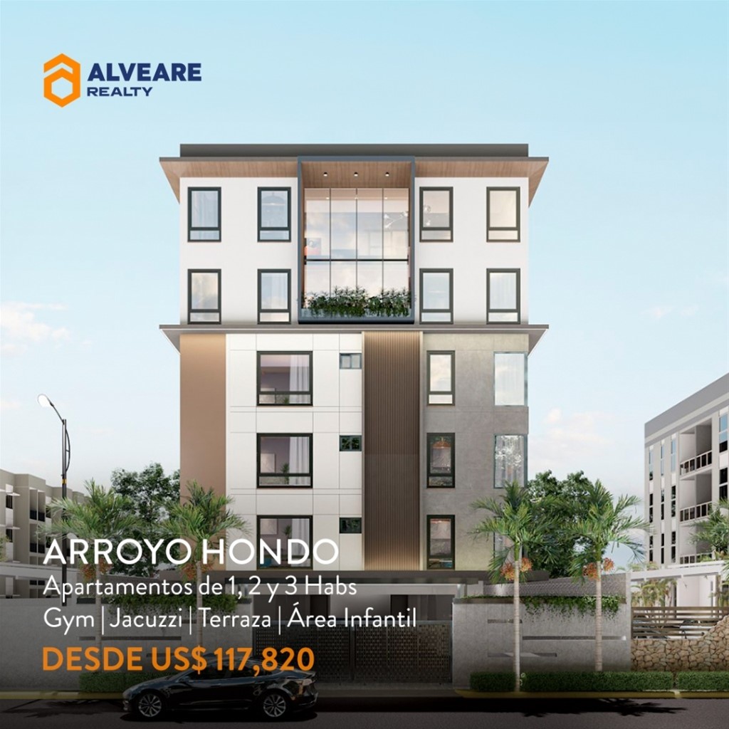 Moderno y completo proyecto de apartamentos de una, dos y tres habitaciones, en el sector de Arroyo Hondo Viejo. 40 apartamentos en total Seguridad 24h Lobby Gimnasio completamente equipado Terraza Destechada Área infantil Planta eléctrica de emergencia Ascensor Parqueos paralelos privados A1576