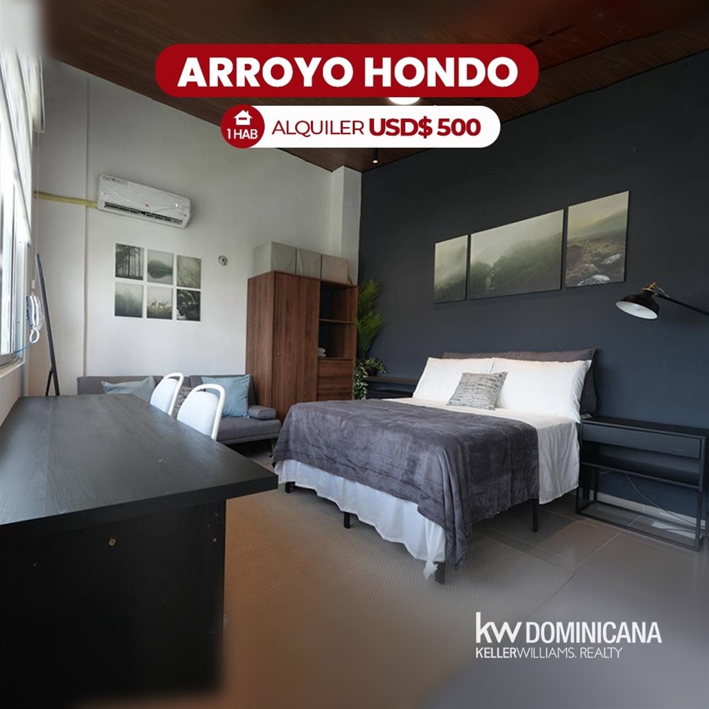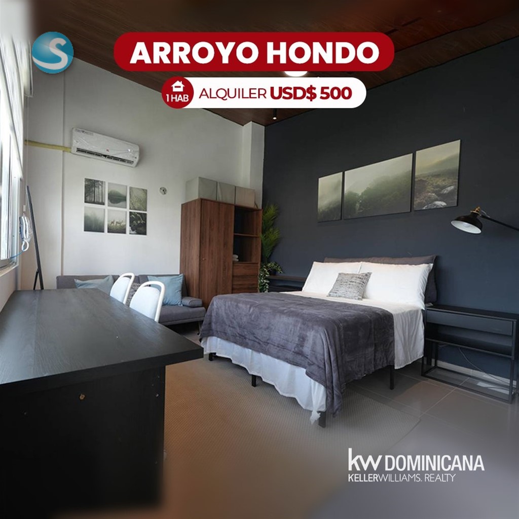 Estudio amueblado en alquiler en Arroyo Hondo!! Moderno, acogedor y totalmente equipado, ideal para una persona o pareja que busca comodidad, privacidad y una excelente ubicación. Características: • 1 habitación tipo estudio • 1 baño • Kitchenette equipada • Piso 5 • 1 parqueo • Excelente ventilación Incluye: • Agua • Electricidad • Servicio de basura • Aire acondicionado • Internet y cable Precio: US$500 mensuales Sugeiley Ozuna 809-885-0795 KW Capital