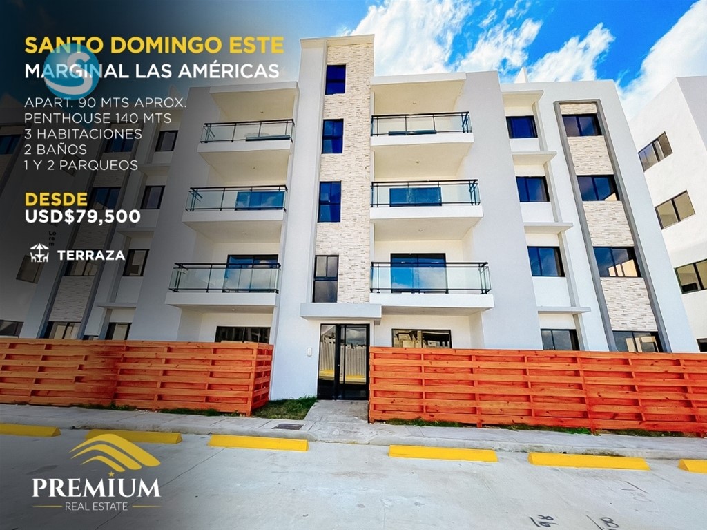 Santo Domingo Este Marginal Las Américas CARACTERISTICAS APARTAMENTOS • Apartamentos de 3 habitaciones • 90 metros aprox. • Sala • Comedor • Cocina con Desayunador • 2 baños completos • Balcon • Area de Lavado • 1 y 2 parqueos por apartamento ACABADOS • Pisos en Porcelanato • Puertas en Melamina • Cocina Modular con tope de granito • Ventanas en vidrio • Pre-Instalación de A/C tipo Split en habitaciones y sala CARACTERÍSTICAS PENTHOUSES Apartamentos de 3 habitaciones • 140 metros aprox. • Sala • Comedor • Cocina con Desayunador • 2 baños completos • Balcón • Sala de Estar • Terraza destechada • Área de Lavado • 2 parqueos Reserve con US$2,000 10% a la Firma 15% Durante la construcción 75% Contra Entrega ?? Precio Desde US$79,500