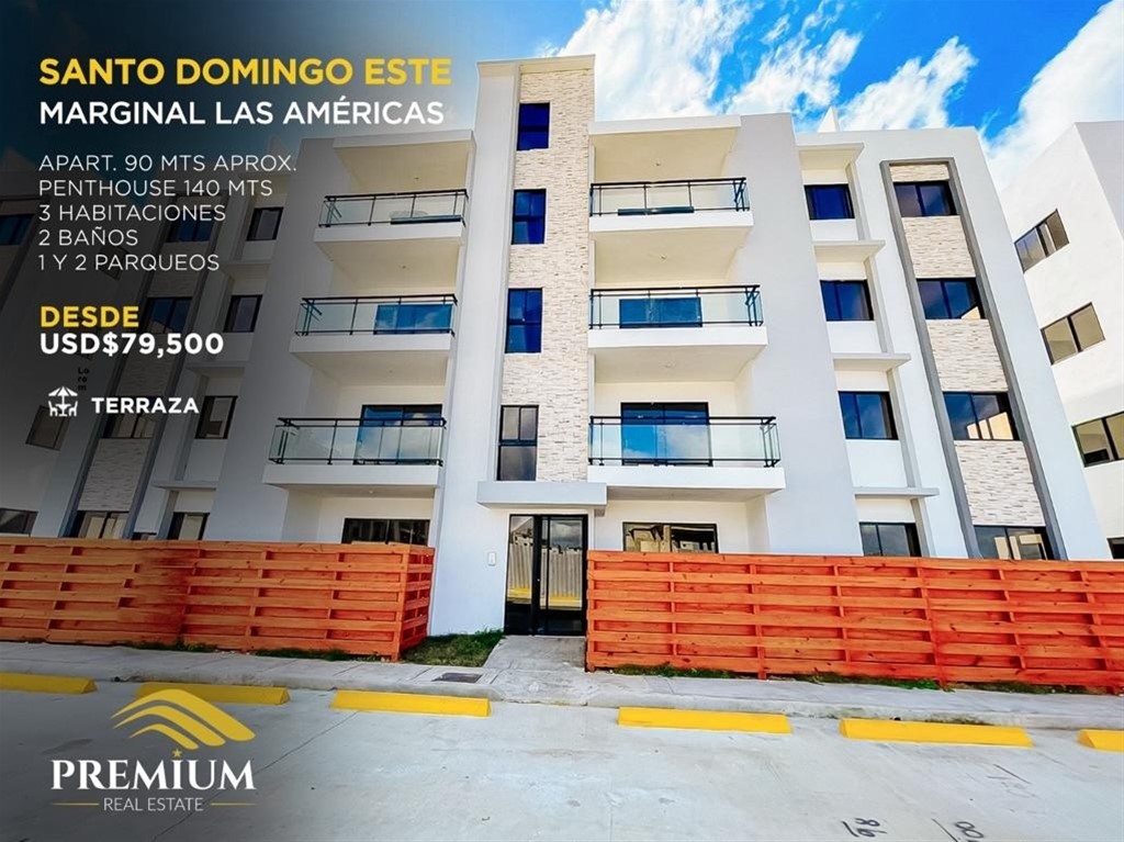 Santo Domingo Este Marginal Las Américas CARACTERISTICAS APARTAMENTOS • Apartamentos de 3 habitaciones • 90 metros aprox. • Sala • Comedor • Cocina con Desayunador • 2 baños completos • Balcon • Area de Lavado • 1 y 2 parqueos por apartamento ACABADOS • Pisos en Porcelanato • Puertas en Melamina • Cocina Modular con tope de granito • Ventanas en vidrio • Pre-Instalación de A/C tipo Split en habitaciones y sala CARACTERÍSTICAS PENTHOUSES Apartamentos de 3 habitaciones • 140 metros aprox. • Sala • Comedor • Cocina con Desayunador • 2 baños completos • Balcón • Sala de Estar • Terraza destechada • Área de Lavado • 2 parqueos Reserve con US$2,000 10% a la Firma 15% Durante la construcción 75% Contra Entrega ?? Precio Desde US$79,500