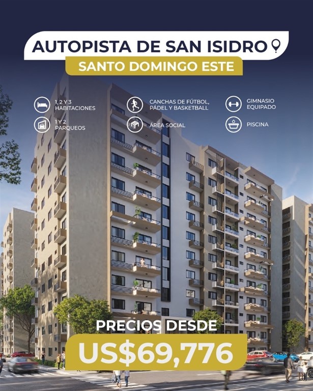 Autopista de San Isidro?? Santo Domingo Este Moderno complejo residencial con acceso controlado, torres de 11 niveles. Apartamentos de 1,2 y 3 habitaciones con 1 y 2 parqueos. Amenidades: Ascensores Piscina Gimnasio completamente equipado Canchas de fútbol, pádel y basketball Juegos infantiles y espacios verdes Área social Precios desde: US$69,776 ¡La oportunidad que estabas esperando para vivir o invertir!