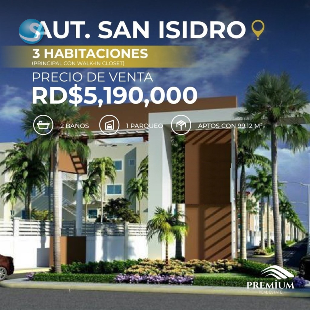 Autopista de San Isidro, SDE Precios desde: RD$5,190,000 Aptos con 99.12 m² + 56.87 m² de terraza privada (exclusiva para el 4to piso) 3 habitaciones (principal con walk-in closet) 2 baños Área de lavado Cocina con desayunador y despensa Sala y comedor separados Balcón 1 parqueo por apartamento Preinstalación para inversor, A/A y tinacos Amenidades • Gazebo para actividades sociales • Área de niños • Áreas verdes Terminación Porcelanato, madera en closets y puertas, cocina modular, tope de granito, cornizas en yeso Condiciones Inicial 20% (forma de pago a discutir) 80% contra entrega (financiamiento o saldo directo) Hasta agosto 2026 para completar el inicial Entrega etapa 5: Octubre 2026.