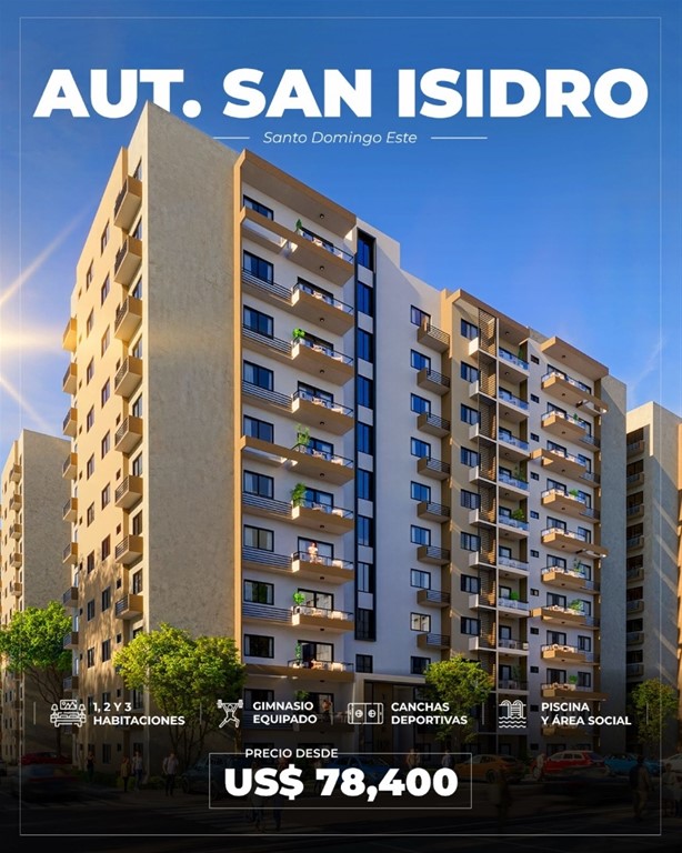 ? NUEVO PROYECTO EN LA AUTOPISTA DE SAN ISIDRO? Vive con confort, modernidad y exclusividad en esta torre de 11 niveles con solo 6 apartamentos por piso. ?? Opciones de 1, 2 y 3 habitaciones ?? Parqueos asignados (opcional adicionales) ?? Ascensores de última generación ?? Amenidades de primera en más de 7,000 m² de área social: ?? Acceso controlado ?? Áreas verdes y juegos infantiles ?? Canchas de basketball, fútbol y pádel ?? Piscina ?? Gimnasio equipado ?? Área social y gazebo ?? Distribuciones desde 49.84 m² hasta 115 m². Apartamentos de 1 habitación (ideal inversión o primera vivienda) Unidades de 2 habitaciones(desde 81 m² hasta 89 m²) Modelos de 3 habitaciones (hasta 115 m²) ?? Plan de pago súper flexible: ?? US$500 para bloqueo ?? 10% a la firma ?? 20% durante la construcción ?? 70% a la entrega ?? Entrega estimada: mayo 2027 ?? Parqueos adicionales disponibles: US$10,000 ??Ubicación privilegiada en la Autopista de San Isidro, una de las zonas de mayor crecimiento y plusvalía. Para mas informacion: Tel. 829-544-8567 Cel. 829-333-5053 Vimardy Bonilla