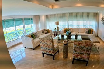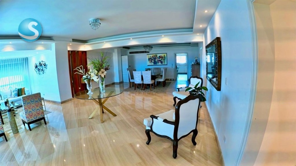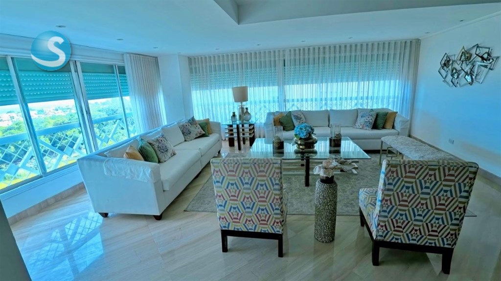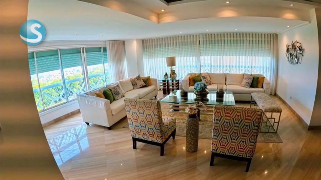 Bello Apartamento, en los cacicazgos, Av. Anacaona Piso 9 con vista espectacular al mar y al parque mirador Sur . Esta totalmente amueblado, vidrios templados, 345 metros cuadrados. Amplio salón, comedor y Estudio 3 habitaciones 31/2 baños Cocina fría equipada Cocina caliente con otra nevera, estufa, lavadora, secadora. Área de servicio con habitación amplia 2 parqueos grandes 1 Locker 1 Ascensores con clave personalizada que llega directamente a tu apartamento. 1 Ascensor de carga Área de Gyn equipada Amplia área de niños con juegos diversos Salón multiuso con BBQ, mesa de tenis, muebles, plantas, etc. Piscina con cheilones, mesas y sillas Amplio y elegante Lobby finamente decorado. Alquiler : US$ 6 mil dólares, mantenimiento incluido. Para citas llamar a Carmelia Suero Asesora Inmobiliria Especialista en Casas y propiedades con Terrazas 829-890-5198 Wthasap disponible Sígueme en Instagram @carmeliasuero_realestate