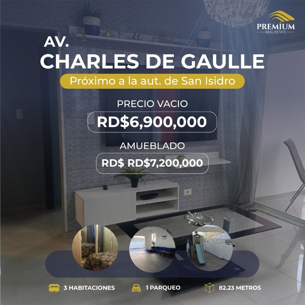 AV. CHARLES DE GAULLE PRÓXIMO A LA AUT. DE SAN ISIDRO Venta Vacío: RD$6,900,000 Venta Amueblado: RD$7,200,000 Características: Nivel 3 82.23 mts 3 habitaciones (principal con su baño privado) 2 Baños Sala Comedor Cocina Balcón Área de lavado Recibidor 1 parqueo Amenidades del proyecto: Rooftop Piscina Área infantil Bar Terraza techada y destechada Seguridad 24/7 Acceso controlado Parqueo de visita Gas común 2 Ascensores