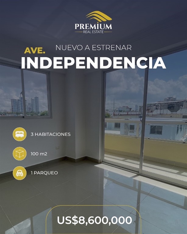Ave. Independencia ?? Nuevo a estrenar 3 habitaciones 2 baños 4to piso 100 m2 Área de lavado Balcón 1 parqueo techado Portón eléctrico Gas común RD$8,600,000
