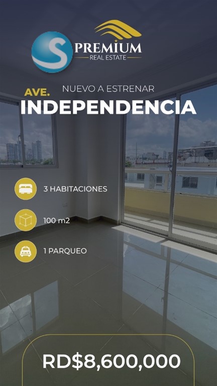 Ave. Independencia Nuevo a estrenar 3 habitaciones 2 baños 4to piso 100 m2 Área de lavado Balcón 1 parqueo techado Portón eléctrico Gas común RD$8,600,000