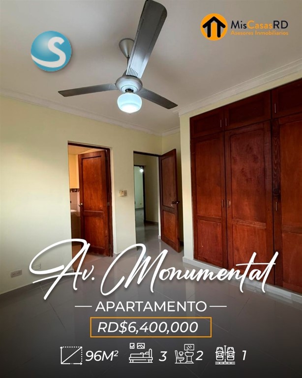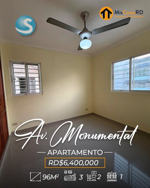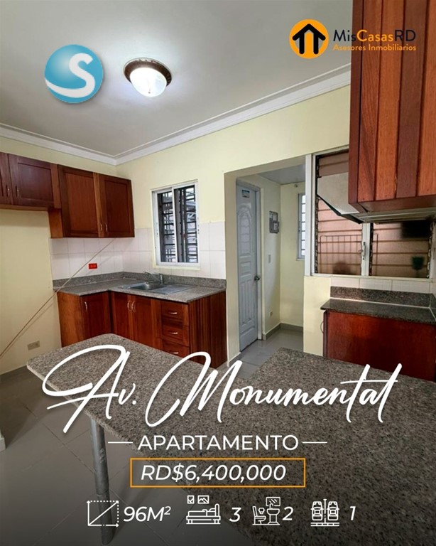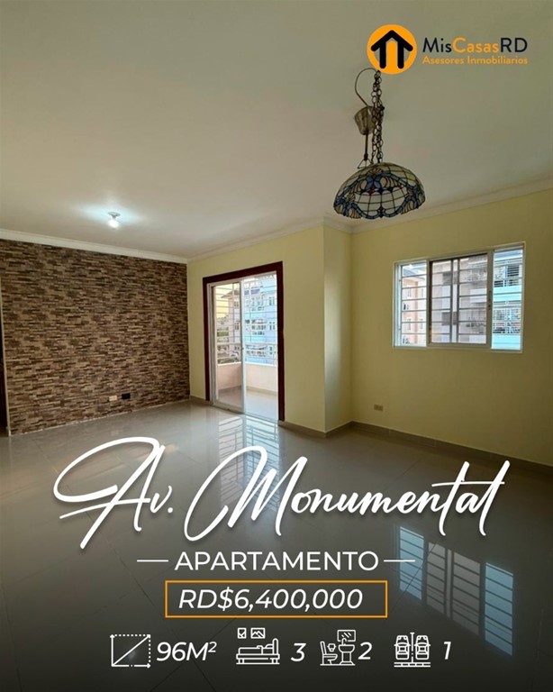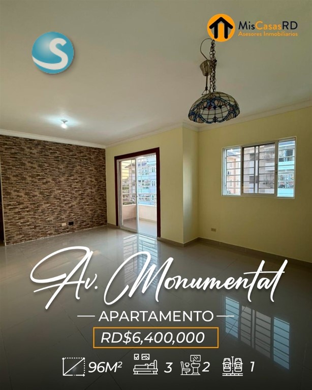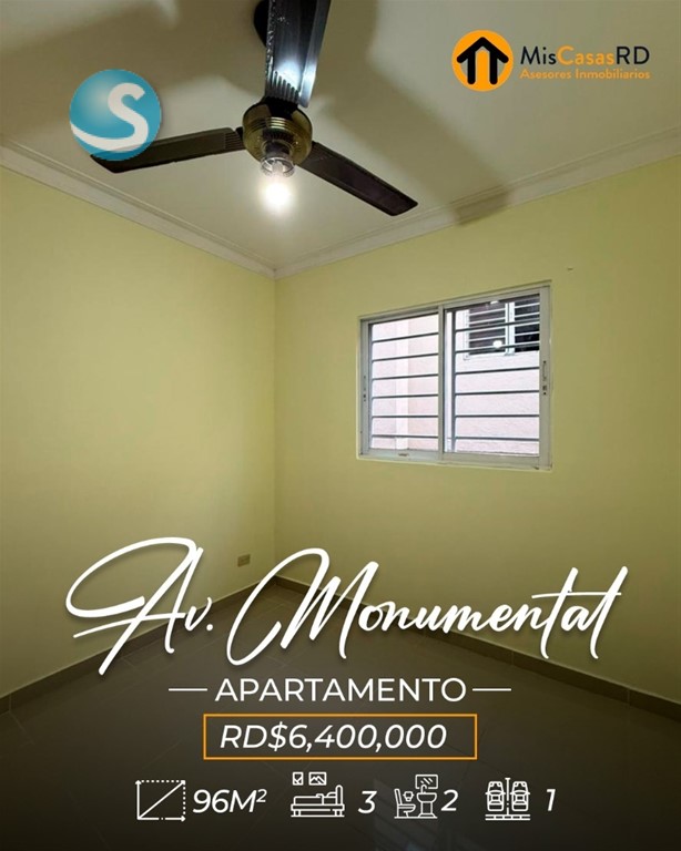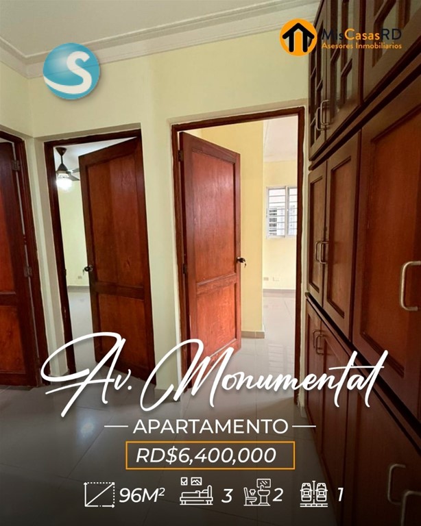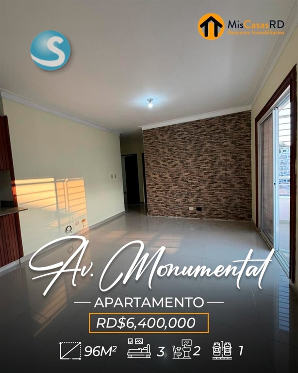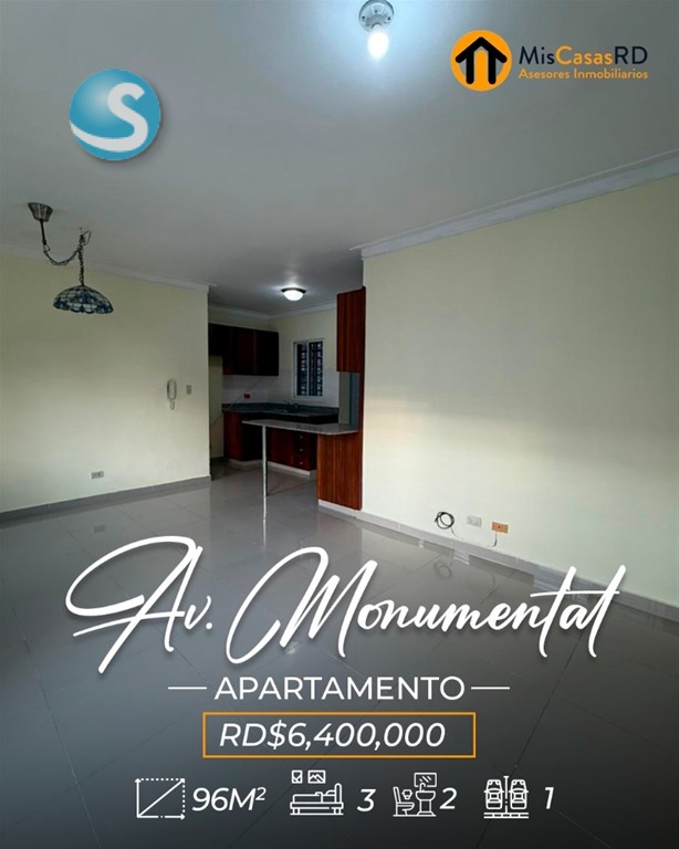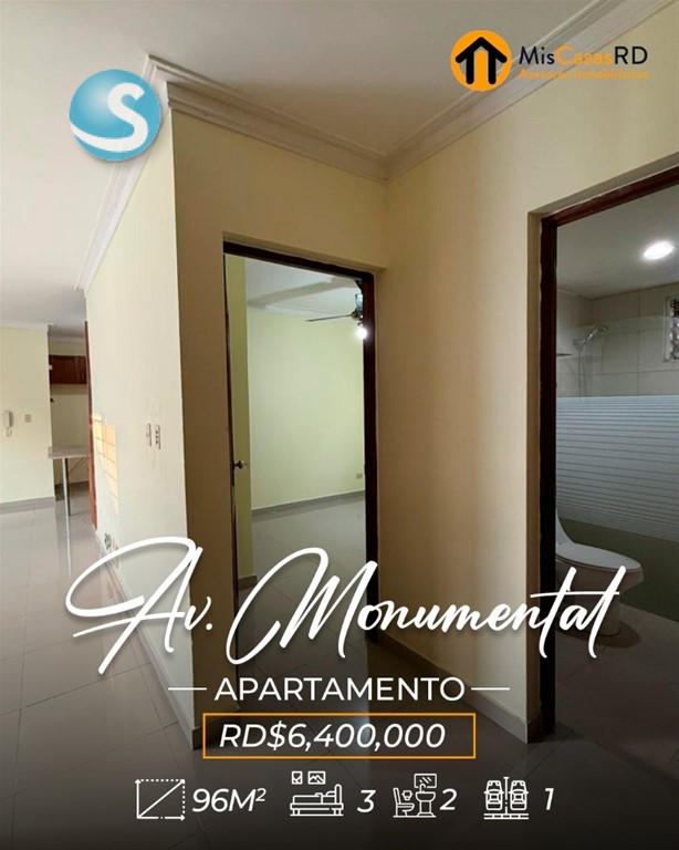 Apartamento en Venta en la Av. Monumental Excelente ubicación en la Avenida Monumental, a solo 7 minutos caminando de la estación del metro en la Autopista Duarte 96.5 m² 3er piso Distribución: Sala Comedor Balcón Cocina con desayunador 3 habitaciones 2 baños Área de lavado 1 parqueo Gas común (se paga aparte) Amenidades del residencial: Piscinas Cancha de tenis y áreas deportivas Áreas verdes Seguridad 24/7 Planta de tratamiento de agua con pozo Precio de venta: RD$6,400,000 Mantenimiento: RD$2,400 (incluye agua, basura y seguridad) Ideal para familias que buscan comodidad, seguridad y excelente ubicación a un precio accesible.