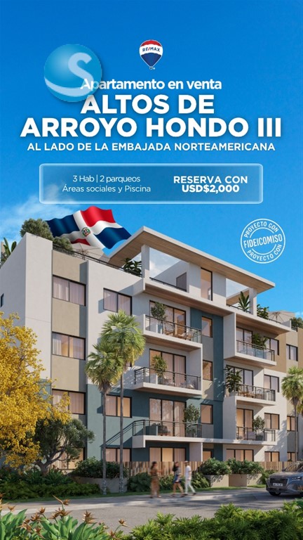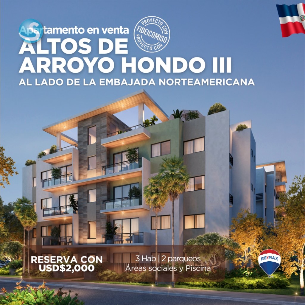 Altos de Arroyo Hondo Llega el proyecto residencial que elevará tu estilo de vida… y tu inversión! Justo al lado de la Embajada Norteamericana, este exclusivo residencial está diseñado para ofrecer confort y una plusvalía garantizada. Con hermosas áreas verdes y jardines exóticos, cada rincón está pensado para brindarte calidad de vida. ÁREAS SOCIALES: Piscina Cancha de Básket y Pádel Área Infantil Zonas de BBQ Gimnasio Área de trote Casa Club Salones de eventos Seguridad 24/7 APARTAMENTOS EXCLUSIVOS: 3 habitaciones (todos con cuarto de servicio) 2 parqueos 1eros niveles con patio y terraza 3eros y 4tos niveles con terraza privada RESERVA HOY CON SOLO USD $2,000 Completa un 10% a la firma del contrato. Paga un 15% durante la construcción. Financiamiento disponible!