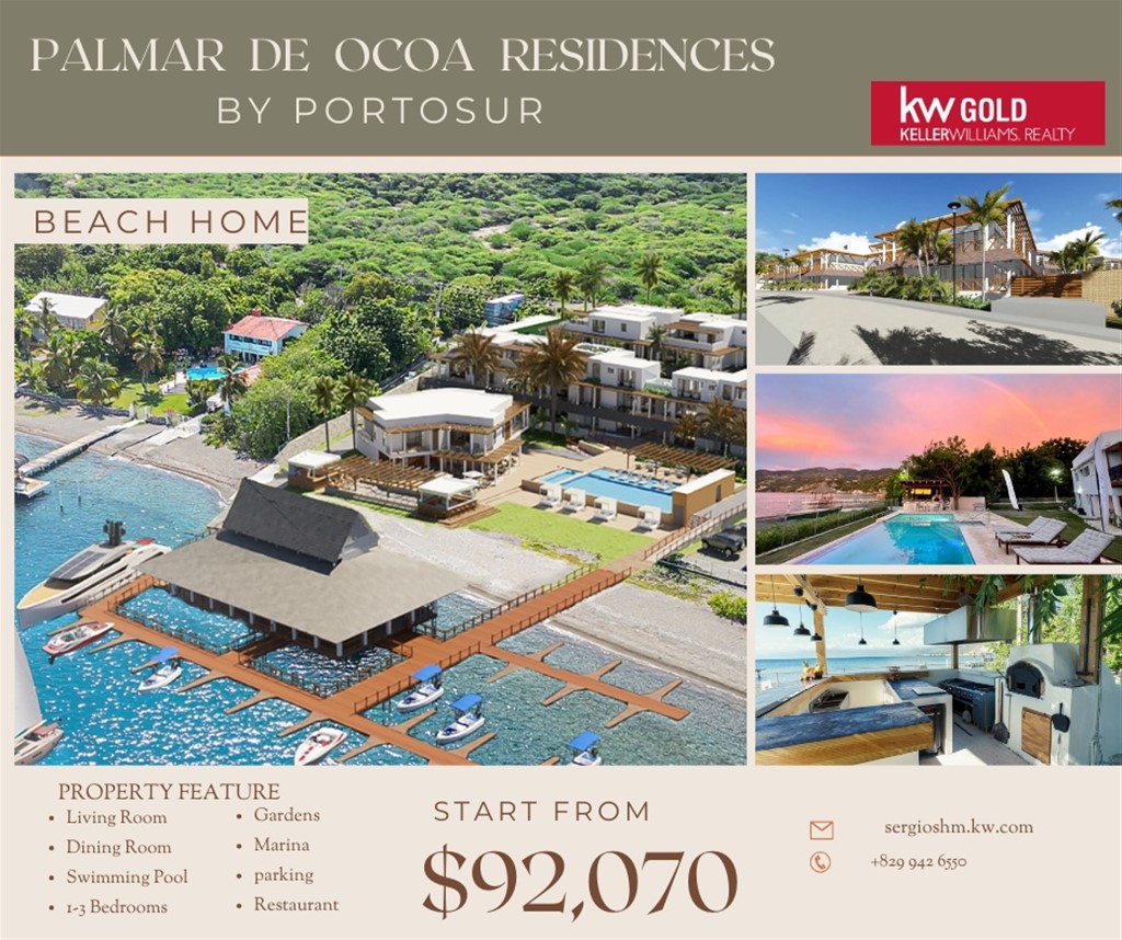 Proyecto en Playa Palmar de Ocoa, en primera linea de playa. Apartamentos de 1,2 y 3 habitaciones, con precios iniciando en US$92,070 con amenidades como playa privada - marina - area comercial - restaurant - mini market - casa club - 3 piscinas - jacuzzy - marina seca para parqueo de botes - Gazebo en la marina - Area de BBQ y horno de pizza a leña