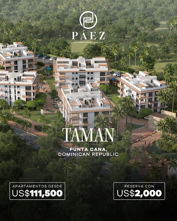 TAMAN | Tu jardín en el paraíso Un exclusivo proyecto en Punta Cana que combina naturaleza tropical, diseño moderno y sostenibilidad. Inspirado en la palabra indonesia “Taman” (jardín), ofrece un estilo de vida caribeño eco-amigable, ideal para vivir, vacacionar o invertir. Ubicación estratégica: A solo 10 minutos de la playa, 18 minutos del Aeropuerto Internacional de Punta Cana y 6 minutos de Downtown Punta Cana. Características del proyecto: •? ?Apartamentos desde 53 m² •? ?Unidades de 1 y 2 habitaciones •? ?144 apartamentos en 9 edificios Amenidades destacadas: •? ?4 amplias piscinas •? ?Gimnasio con sauna •? ?Spa y área de bienestar •? ?Cancha de tenis •? ?Senderos ecológicos para caminar y andar en bicicleta •? ?Áreas de barbacoa y cabañas para relajación •? ?Restaurantes y tiendas dentro del complejo •? ?Transporte privado a la playa •? ?Seguridad 24/7 •? ?Parqueos y amplias zonas verdes PRECIOS DESDE US$111,500 hasta US$290,000.00 Plan de pago flexible: •? ?US$2,000 para separación •? ?20% a la firma del contrato •? ?40% durante el proceso constitutivo •? ?40% contra entrega Para más información o consultas, visita nuestra web Ramón Aníbal Páez Paez Intl. Realty Cel: +1 (849) 408-0711?Cel: +1 (809) 945-1862