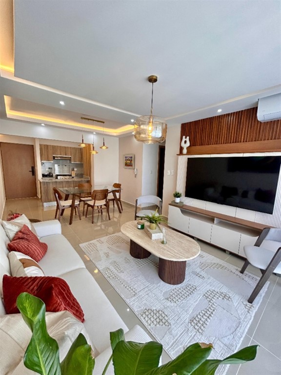 Este moderno apartamento en Bávaro, Punta Cana, ofrece un estilo de vida inigualable. Características del apartamento: Amueblado finamente, este cuenta con dos habitaciones, dos baños, una cocina moderna, una sala-comedor amplia y un espacio de estacionamiento. Amenidades del residencial: El residencial ofrece seguridad privada con acceso controlado las 24 horas, tres áreas con piscinas, jacuzzis y parque acuático, zonas deportivas con canchas de voleibol, baloncesto y fútbol, espacios para BBQ, salón de usos múltiples y una ubicación estratégica cerca de centros comerciales y restaurantes.