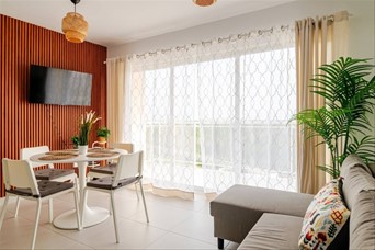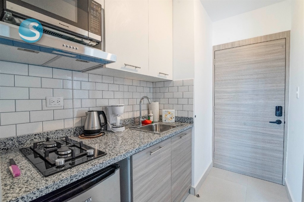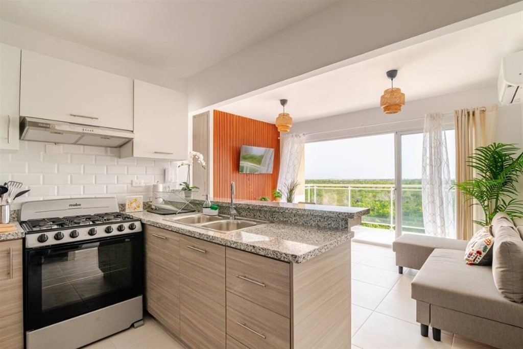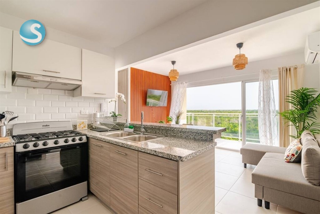 El apartamento es nuevo, se ha usado como Airbnb unas 4 veces. Esta dividido en dos apartamento con dos puertas de entrada independiente, pero si alguien lo quiere unificar solo es eliminar la puerta interior. El Apartamento grande tiene 2 alcobas, dos baños, cocina completa, sala comedor y un gran balcon con una hermosa vista al horizonte y a la piscina del condominio. El apartamento pequeño, practicamente es un estudio que consta de un cuarto, closet walk-in, baño y una pequeña cocina pero muy bien equipada. Adicionalmente tiene una terraza, la cual tiene proyeccion para construir lo que se quiera, bien sea un area de pic-nic, un estudio, un baño, etc. Adicionalmente tiene dos parqueaderos. El apartamento esta completamente amoblado y decorado con sencillez pero con elegancia. Se le hizo instalacion de estufa a gas con extractor de grasa y olores, 4 aires acondicionados, Nevera, Lavadora/Secadora, calentador a gas, cerraduras electronicas