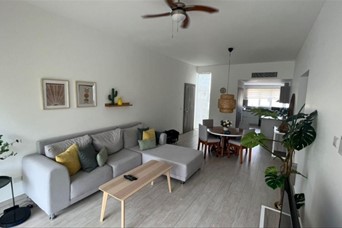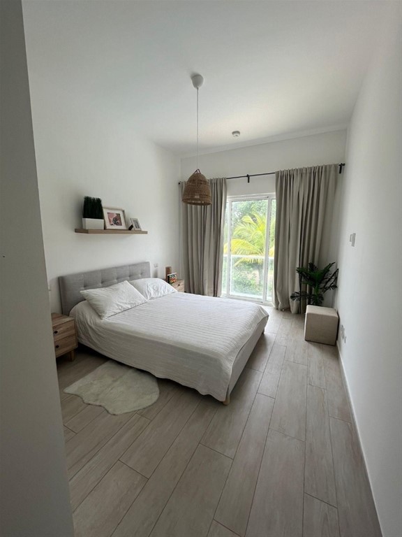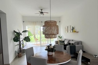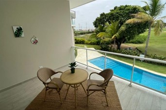 Hermoso apartamento en Cocotal con hermosa vista al Campo de Golf y a la piscina. Esta en un segundo piso con techos altos y tiene un balcon tipo terraza con baños y cocina modernos. El apartamento se renta amueblado y el precio de alquiler incluye el mantenimiento del condominio y del residencial. El apartamento está en excelentes condiciones. Posee aire central con sus controles en cada area.