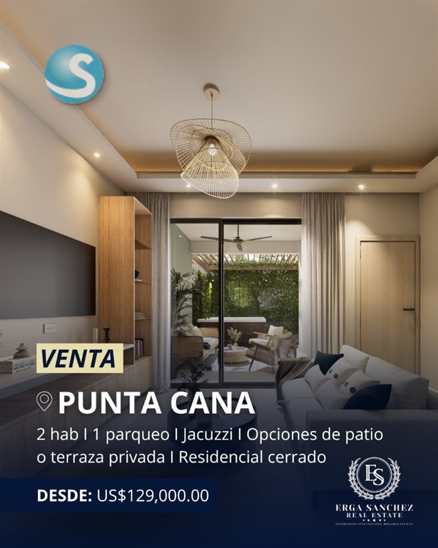 Proyectos de Apartamentos con Jacuzzi en Punta Cana Exclusivo proyecto residencial de diseño moderno ubicado en Residencial Bávaro Punta Cana, una zona estratégica con rápido acceso a Downtown Punta Cana, centros comerciales, restaurantes y las hermosas playas de la zona. Proyecto boutique con solo 18 apartamentos, ideal para vivir, vacacionar o invertir en renta vacacional en una de las zonas de mayor crecimiento inmobiliario del Caribe. CARACTERÍSTICAS DEL PROYECTO: Apartamentos de 2 habitaciones y 2 baños Desde aproximadamente 80 m² de construcción 1 parqueo por unidad TIPOS: Apartamentos primer nivel con patio privado + jacuzzi Apartamentos segundo nivel (penthouse) con amplia terraza + jacuzzi AMENIDADES: Gazebo Área de solárium Áreas sociales Parqueos privados Proyecto dentro de residencial cerrado TERMINACIONES: Pisos en porcelanato Cocina modular moderna con tope de cuarzo Puertas en madera preciosa Baños revestidos en porcelanato Diseño contemporáneo con espacios funcionales ?? Un proyecto ideal para inversión en Punta Cana, con alto potencial para renta vacacional ?? Entrega estimada: 2027 ?? PRECIOS DESDE: US$129,000 #ES