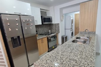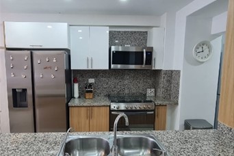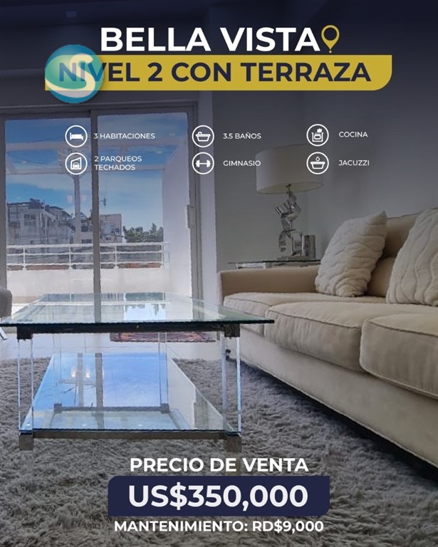 Bella Vista Nivel 2 con terraza 177m2 130m2 netos 47m2 de terraza 3 Habitaciones 3.5 Baños Sala / Comedor Cocina Balcón frontal Área de lavado Cuarto de servicio con su baño 2 parqueos techados paralelos Amenidades de la Torre: Lobby Dos ascensores Jacuzzi Salón multiuso Gimnasio Área infantil Planta eléctrica Pre-Instalación de Aires Acondicionados Intercom Seguridad 24/7 ….. Precio de venta: US$350,000 Mantenimiento; RD$9,000