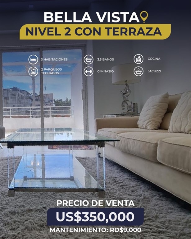 Bella Vista Nivel 2 con terraza 177m2 130m2 netos 47m2 de terraza 3 Habitaciones 3.5 Baños Sala / Comedor Cocina Balcón frontal Área de lavado Cuarto de servicio con su baño 2 parqueos techados paralelos Amenidades de la Torre: Lobby Dos ascensores Jacuzzi Salón multiuso Gimnasio Área infantil Planta eléctrica Pre-Instalación de Aires Acondicionados Intercom Seguridad 24/7 ….. Precio de venta: US$350,000 Mantenimiento; RD$9,000