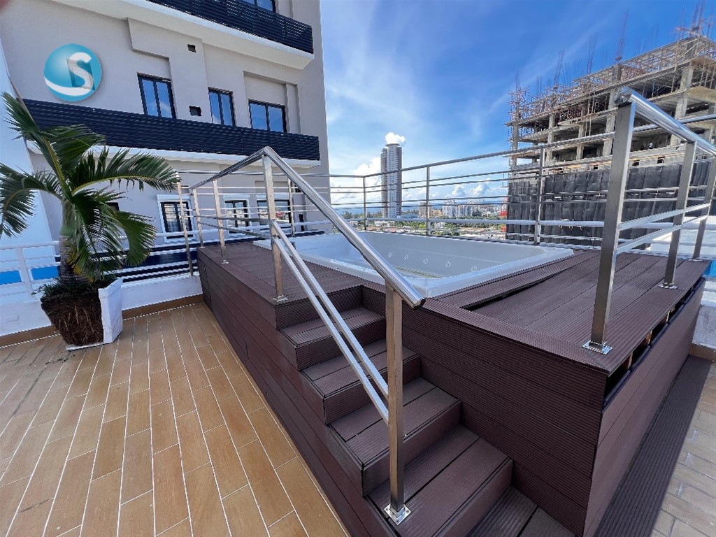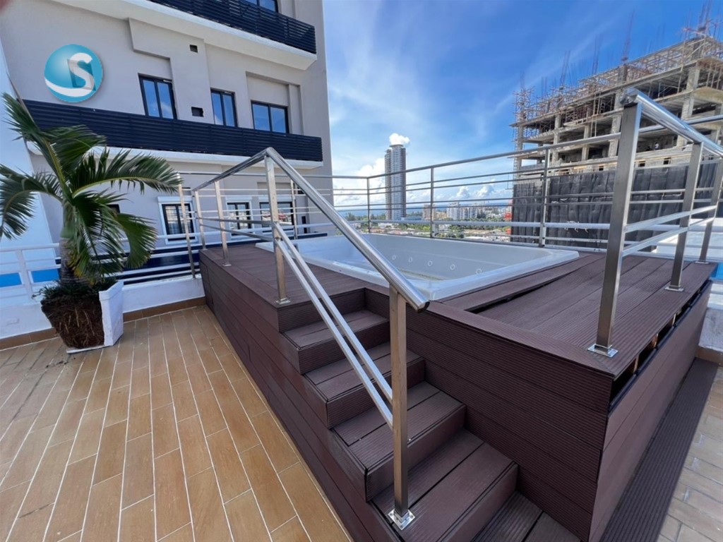 BELLA VISTA SUR ?? Calle Eduardo Vicioso (detrás del Body Shop) ?? Nivel 8 | 100 m² Distribución: 2 habitaciones 2 baños completos Cocina modular Sala / Comedor Área de lavado Cuarto útil con baño 1 parqueo techado Amenidades: Lobby climatizado Terraza con área de BBQ Jacuzzi Ascensor Planta eléctrica full Seguridad 24/7 ?? Precio de alquiler: US$1,000 ?? Incluye mantenimiento y aires acondicionados