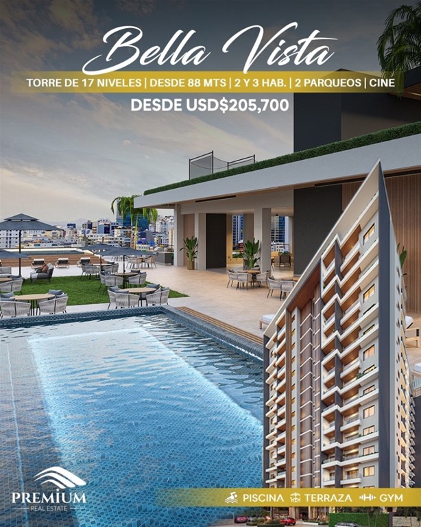 Bella Vista ?? ?? Lujosa Torre de 17 niveles, donde podrás disfrutar de una magnífica vista 360. ? 2 y 3 habitaciones ? 2 parqueos ? C/h con su baño ? Estudio Amenidades. ? Lobby con coffeeshop ? Dos niveles de área social ? Terraza ? Sauna ? Gym ? Cine ? 6 ascensores ? 4 piscina ? Área de Jogging con pista de crossfit ? Mini golf ?? Desde US$188,800 ?? Forma de pago ? Separa con US$2,000 ? 10% firma de contrato ? 30% durante la construcción ? 60% financiamiento