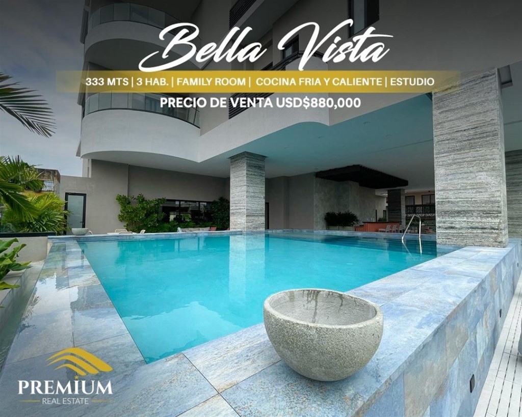 Apartamento de Lujo Ubicado en el Exclusivo Sector de Bella Vista ?? .......................................................... • 333 mts?? • 3 Habitaciones con baño y Walk-in Closet • Vestíbulo de Entrada • Medio baño para visitas • Estar • Sala • Comedor • Estudio • Family Room • Balcón tipo terraza • Cocina fría y Caliente • Closet de Ropa Blanca • Área de Lavado • Cuarto de servicio con su baño • Locker • 4 Parqueos ......................................... • Amplio Lobby Principal • Salón Multiuso con bar • Salón para actividades con kitchenette y bar • Piscina para adultos • Piscina para niños • Gimnasio Equipado • Área de niños • Área de BBQ con kitchenette y bar • Baños para damas y caballeros con sauna • Gas Común • 2 Ascensores de lujo • 1 Ascensor de servicio ...................................................... ??Precio de venta: US$880,000