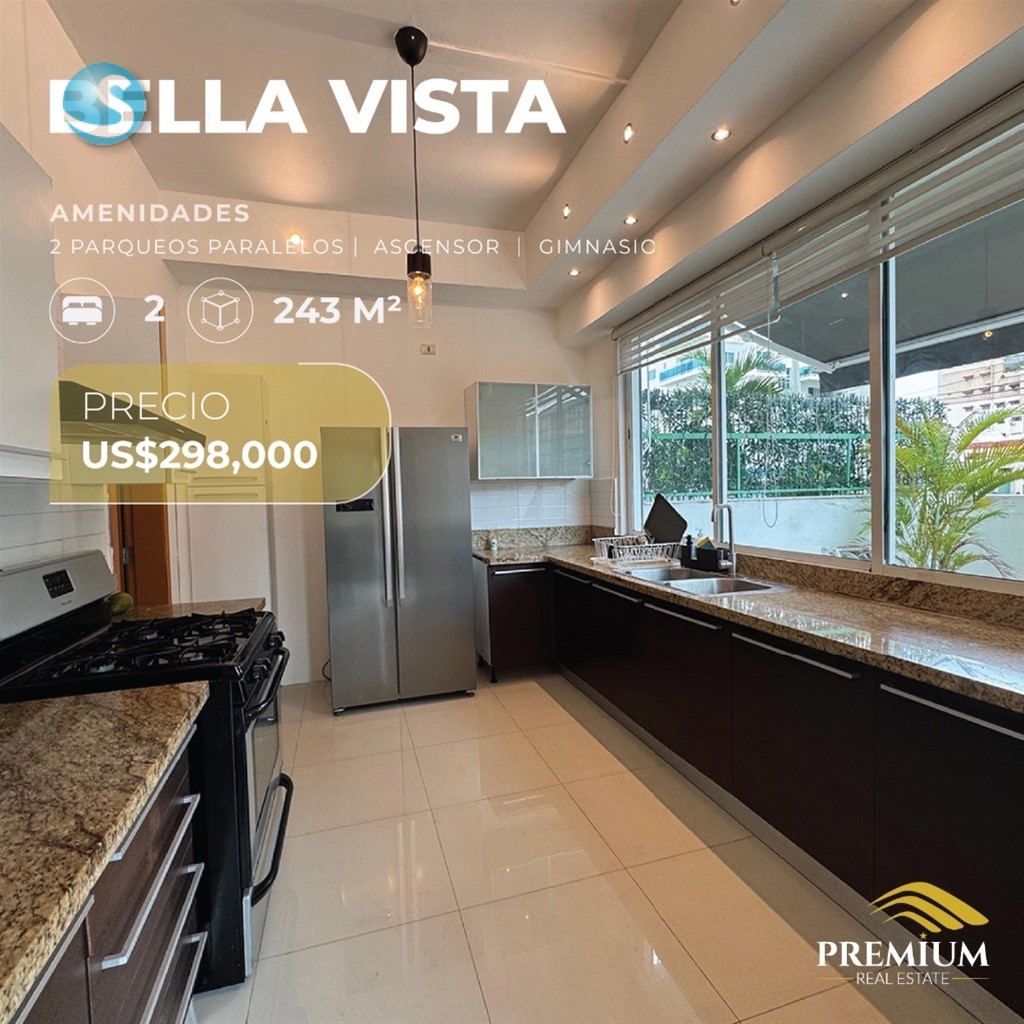 Vendo Segunda con Amplia Terraza en Bella Vista 243 metros Piso 2 Terraza super espaciosa 2 Habitaciones 2 Baños Sala Comedor Cocina amplia Area de Lavado Cuarto de Servicio 2 parqueos paralelos Shutters en todo el apartamento Amenidades: Ascensor Lobby Gimnasio Área social Precio de Venta: US$298,000 Mantenimiento US$13,600