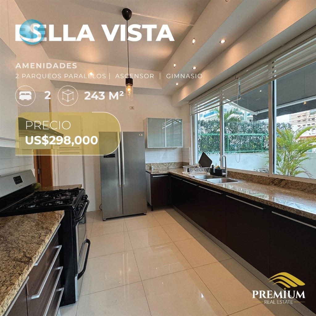 Vendo Segunda con Amplia Terraza en Bella Vista 243 metros Piso 2 Terraza super espaciosa 2 Habitaciones 2 Baños Sala Comedor Cocina amplia Area de Lavado Cuarto de Servicio 2 parqueos paralelos Shutters en todo el apartamento Amenidades: Ascensor Lobby Gimnasio Área social Precio de Venta: US$298,000 Mantenimiento US$13,600
