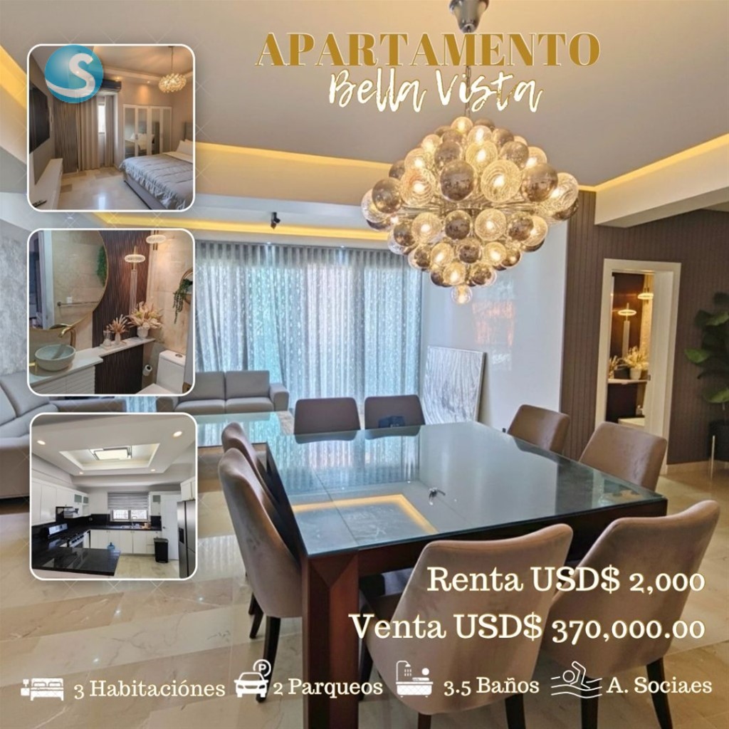 Descubre este amplio y elegante apartamento en Bella Vista, disponible para venta o alquiler, completamente equipado con línea blanca. Su diseño funcional integra sala-comedor, balcón, estudio y baño de visita, brindando espacios luminosos, modernos y bien distribuidos. Características principales *Balcón *Sala *Comedor *Estudio *Baño de visita *3 habitaciones, cada una con su baño privado *Habitación principal con walking closet *Cocina abierta con desayunador *Área de lavado *Cuarto de servicio *2 parqueos Amenidades del residencial: -Lobby climatizado -Acceso videoportero -Gimnasio equipado -Piscina -Terraza social -Área de BBQ Venta: US$370,000 Alquiler: US$2,000