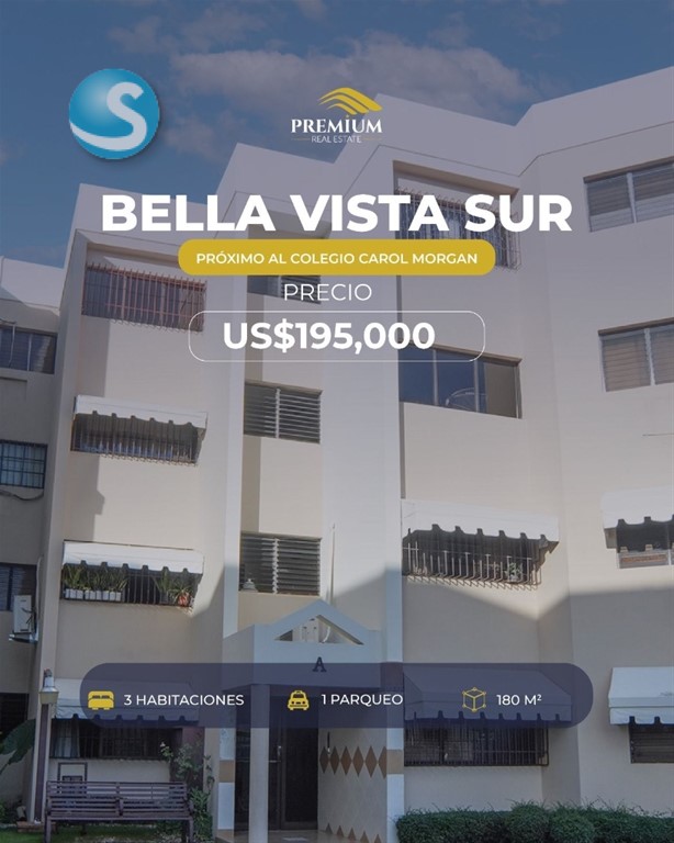 Bella Vista Sur, Av. Núñez de Cáceres, próximo al colegio Carol Morgan Torre familiar 180mts 4to nivel sin ascensor 3 habitaciones (principal con baño y W/C) 2.5 baños Sala Cocina con desayunador Comedor Cuarto de servicio con su baño Área de lavado 1 parqueo destechado Intercom Portón eléctrico …. Precio de venta; US$195,000 Mantenimiento: RD$5,000