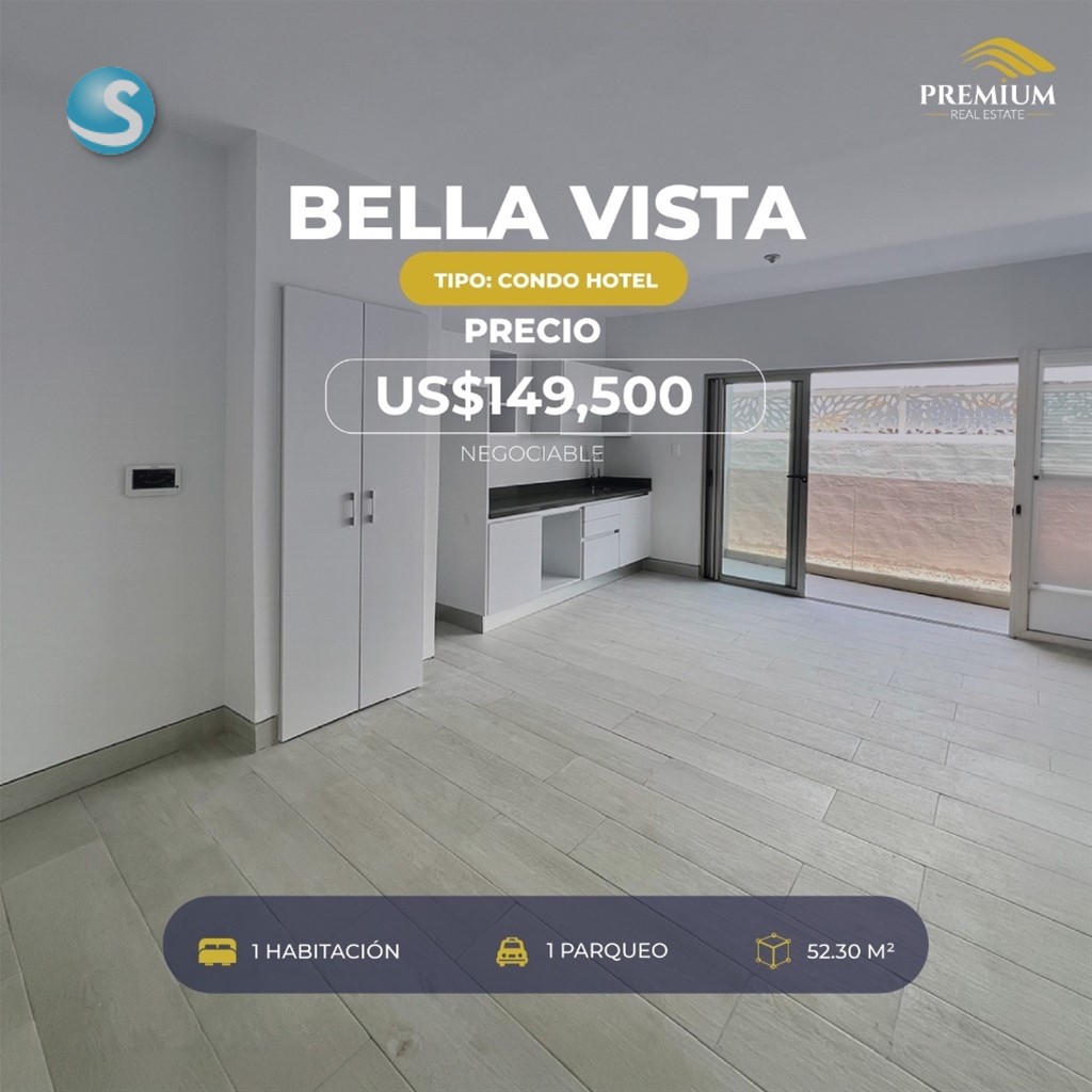 Bella Vista, Tipo Condo Hotel Apartamento: Nivel 11 52.30 mts 12.50 mts de parqueo 1 Hab con walk-in closet y baño 1.5 baños Sala-comedor Cocina Balcón 1 parqueo soterrado Cerradura inteligente Preinstalación de aire acondicionado central Pre-Instalación de Gas Gas común con medidor Calentador AMENIDADES: Lobby Amueblado Área Social Sport Bar Gimnasio totalmente equipado Piscina en el rooftop Baños y duchas privadas en el área de la piscina y el gimnasio. Salón de reuniones de la torre 2 ascensores modernos Seguridad privada 24/7 12 Niveles de Construcción. Sport-Bar Precio: US$149,500 Negociable
