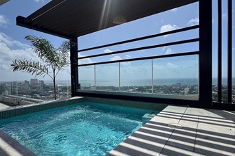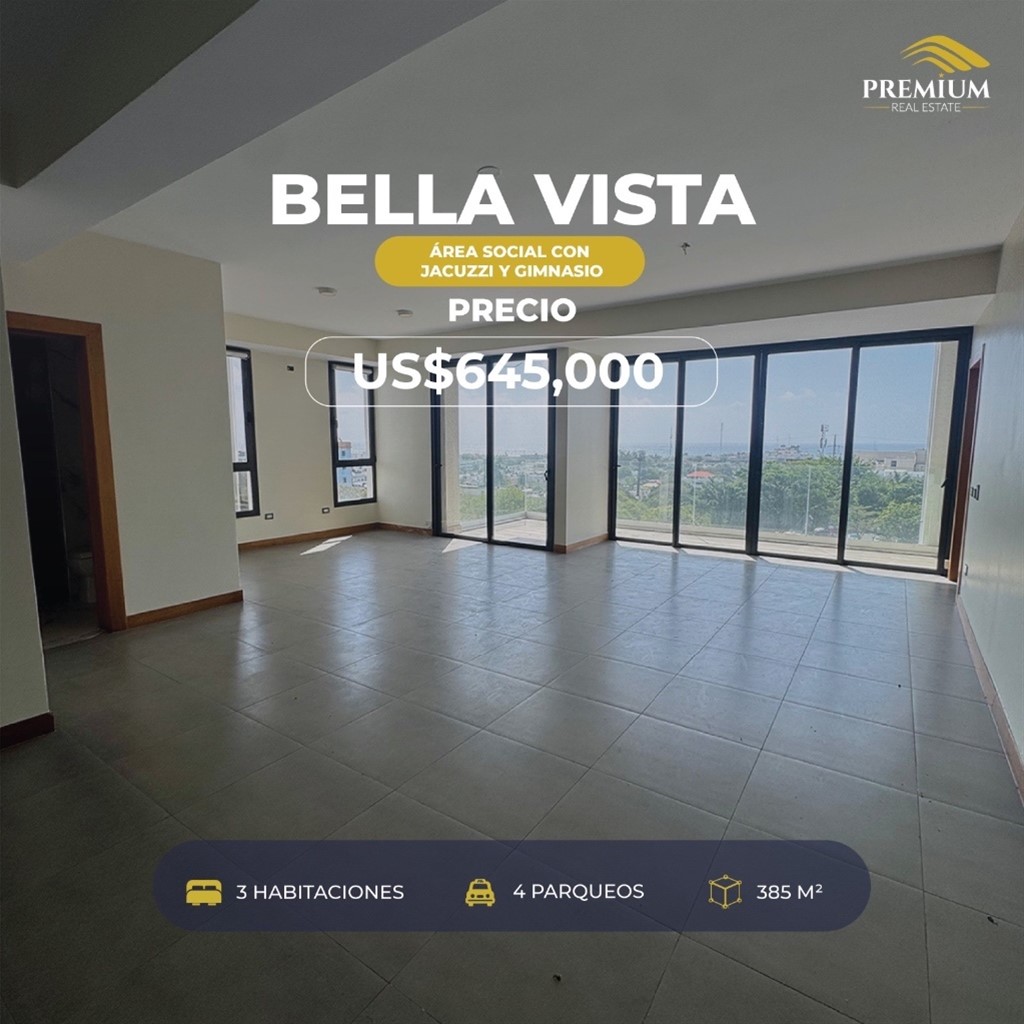 ¡Bella vista ! 3 habitaciones 385 mt2 4 parqueos Nivel 5 3,5 baños Cuarto de servicio Área de lavado Sala Cocina Comedor Family Estudio Balcones Área social Jacuzzi 3 lobby Gym Precio de Venta US$645,000