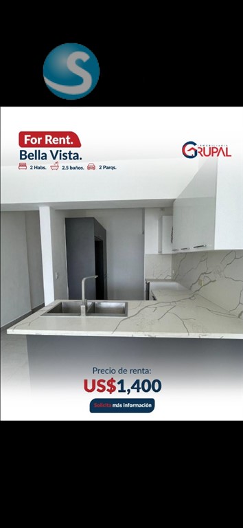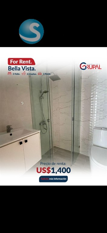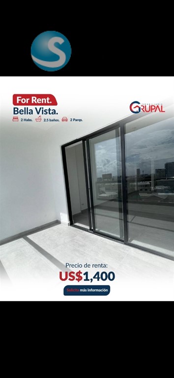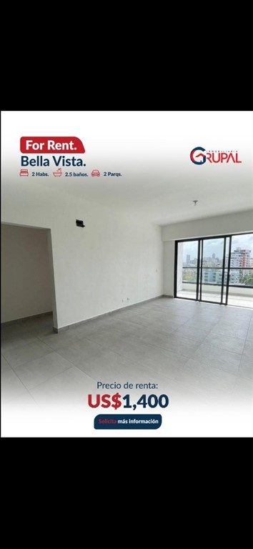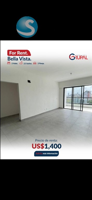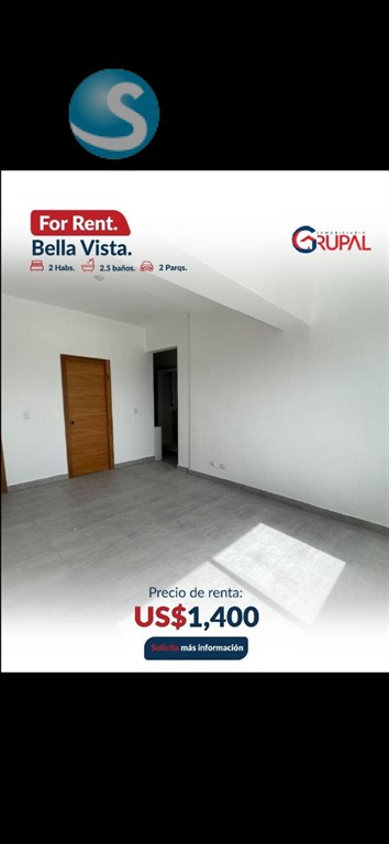 Renta de apartamento en Bella Vista?? ?????????????????????????????? ?????? ?????????????????????? ?2 habitaciones con walk in clóset ?2 baño completo ?Medio baño de visita ?Balcón ?Sala ?Comedor ?Cocina ?Desayunador ?Área de lavado ?2 parqueos paralelos ?????????????????????????????? ?? ???????????????????? ???? ???? ?????????? ??Planta Eléctrica ??Portón Eléctrico ??Seguridad 24/7 ??4 ascensores de última generación ??Lobby Climatizado amueblado ??2 Salones de Eventos ??Gimnasio ??Área de niños ??Cine ??Terrazas Techadas y Destechadas ??Piscina Infinity ??2 áreas para bbq ??Áreas de Bar ??Área de juego ??Cámaras de Seguridad ??Control de Acceso ???????????? ???? ???????????????? USD $1,400????