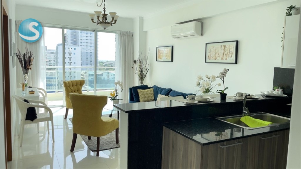 TORRE LUJO BELLA VISTA 1 Hab. C/ WorkCloset 2 baños completos Sala Amueblada Sofá Cama Desayunador Cocina Equipada completa Área de Lavado, Lavadora secadora Calentador Balcón amueblado 1 parqueo Área neta 90 mt2 Totalmente Amueblado Amenidades torre Seguridad y concergeria 24h Lobby climatizado 2 Ascensores Gym moderno completo Área de bbq Piscina vista al mar Salón de evento rooftop Piso 10 Valor: US$1,100 mant. Incluido