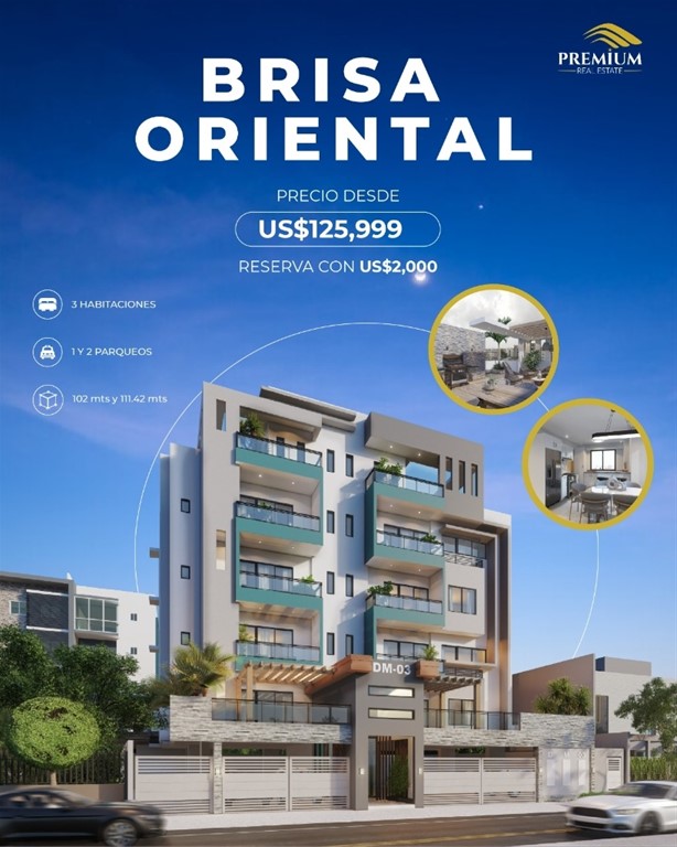 BRISA ORIENTAL ?? ? 102 mts y 113 mts ? 3 Habitaciones ? Habitación principal con Walking closet ? 2.5 Baños ? Sala y Comedor ? Cocina ? Balcón ? Terraza para el segundo piso ? Cuarto piso con terraza privada ? 2 Parqueos ?? Amenidades: ? Lobby doble altura ? Cada apartamento con 1 Locker ? Bomba sumergible ? Cisterna ? Closet de ropa blanca ? Pre-instalación de A/A ? Camara de seguridad ? Portones eléctricos ? Pre-instalación de tinaco ? Reserva con US$1,000 ? Separación: 10% ? Inicial: 20% (durante la construcción) ? Contra entrega: 70% (finales 2025) ......................................................... ?? Precios desde: US$125,999 Th