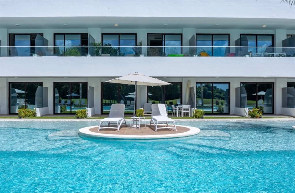 APARTAMENTO EN PUNTA CANA Exclusivo Condominio a solo 500 metros del Club de Golf Cana Bay, con espectaculares amenidades y beneficios que lo convierten en el lugar ideal para tu inversión.  TOTALMENTE AMUEBLADO US$299,000 TERRAZA CON JACUZZI 147 metros 2 habitaciones 2 baños Sala Comedor Cocina con desayunador Amplio balcón tipo L Jacuzzi privado 1 parqueo Amenidades: Dos Piscinas tipo Laguna Dos Bares Gimnasio Equipado  Área de BBQ  Areas Infantiles  Lobby  Vistas al campo de golf  Club de Playa  Beneficios: Los propietarios pueden acceder a descuentos y precios preferenciales al momento de jugar golf y tenis, también obtienen un descuento al momento de hacer sus reservas en Hard Rock y los hoteles Riu.