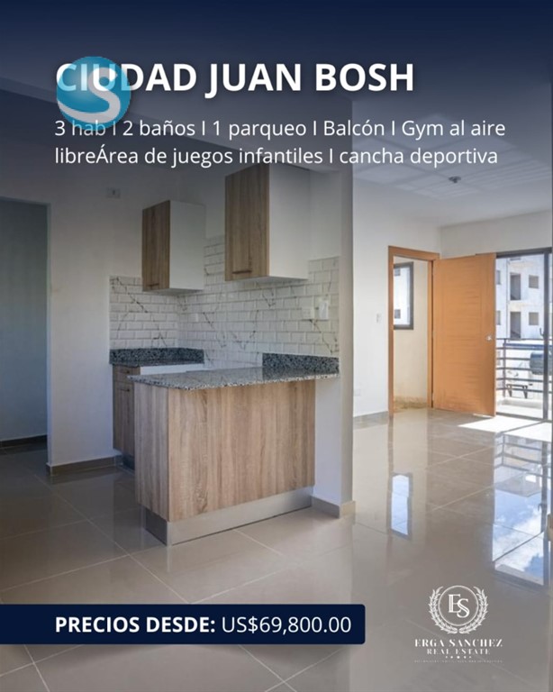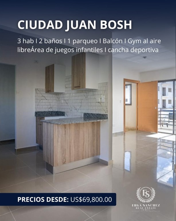 Proyecto de Apartamentos en la Ciudad Juan Bosh - Airbnb Frendly Un proyecto diseñado para ofrecer practicidad, buena vida y espacios que aportan bienestar real. Disfruta jardines, áreas recreativas, salón multiusos, huertos urbanos, gimnasio al aire libre, área infantil, cancha deportiva y gazebo familiar. TIPOS: Apartamentos con Patio (Primer Nivel) Metraje: 90–91 m² Distribución: 3 hab · 2 baños · balcón · patio · 1 parqueo Desde: US$ 82,500 Apartamentos Estándar (Niveles Intermedios) Metraje: 76–77 m² Distribución: 3 hab · 2 baños · balcón · 1 parqueo Desde: US$ 69,800 113–119 m² Distribución: 3 hab · 2 baños · balcón · terraza privada · 1 parqueo Desde: US$ 84,800 – 86,500 FECHA DE ENTREGA: Junio 2027 Separación: US$ 500 PRECIOS DESDE: US$69,800 #ES