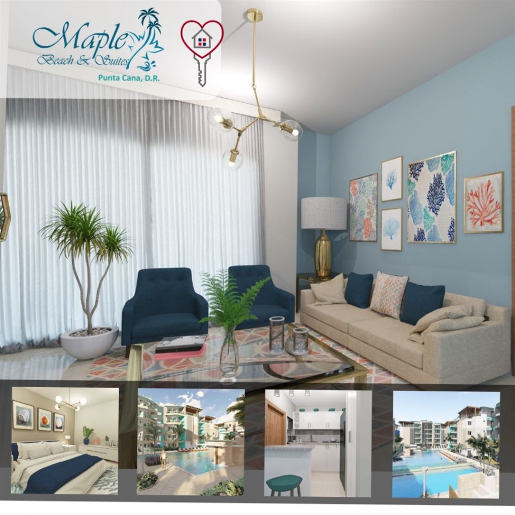 Maple Beach Is a new project in the center near Bávaro Punta Cana. It is located just meters from one of the best beaches in the Dominican Republic, Bávaro Beach (El Correctio, just a 4-minute walk). MAPLE BEACH is an exclusive residential community, composed of 76 apartments of 2 and 3 bedrooms with bathrooms, living room, dining room, kitchen, laundry room and balconies with a view to the pool. Each one of the buildings has a common area with access to stairs and elevator, besides represents the best option for investors with Lock Out sistems that allows owner double income when necesary. The 4th floor of each building are Penthouses with a private terrace and view to the ocean and or to the pool. The common areas will include pool with bar, BBQ area, kids playground and garden areas designed to satisfy the most demanding clients. The community will have covered parking, valet parking, security 24/7 and free Wi-Fi in common areas. In the front-part of the community you will find Maple Plaza with 19 commercial shops Maple Beach es un nuevo proyecto en el centro de Bávaro Punta Cana. Se encuentra a escasos metros de una de las mejores playas de República Dominicana, Playa Bávaro (El Cortecito, a solo 2 minutos a pie). MAPLE BEACH es una exclusiva comunidad residencial, compuesta por 76 departamentos de 2 y 3 recámaras con baños, sala, comedor, cocina, lavandería y balcones con vista a la alberca. Cada uno de los edificios tiene un área común con acceso a escaleras y ascensor. El 4 ° piso de cada edificio son Penthouse con terraza privada y vista al mar y / o a la alberca. Las áreas comunes incluirán alberca con bar, área de BBQ, área de juegos para niños y áreas ajardinadas diseñadas para satisfacer a los clientes más exigentes. La comunidad contará con estacionamiento techado, valet parking, seguridad 24/7 y Wi-Fi gratis en áreas comunes. En la parte delantera de la comunidad encontrará Maple Plaza con 19 tiendas comerciales, Los propietarios contaran con acceso a un exclusivo club de playa.