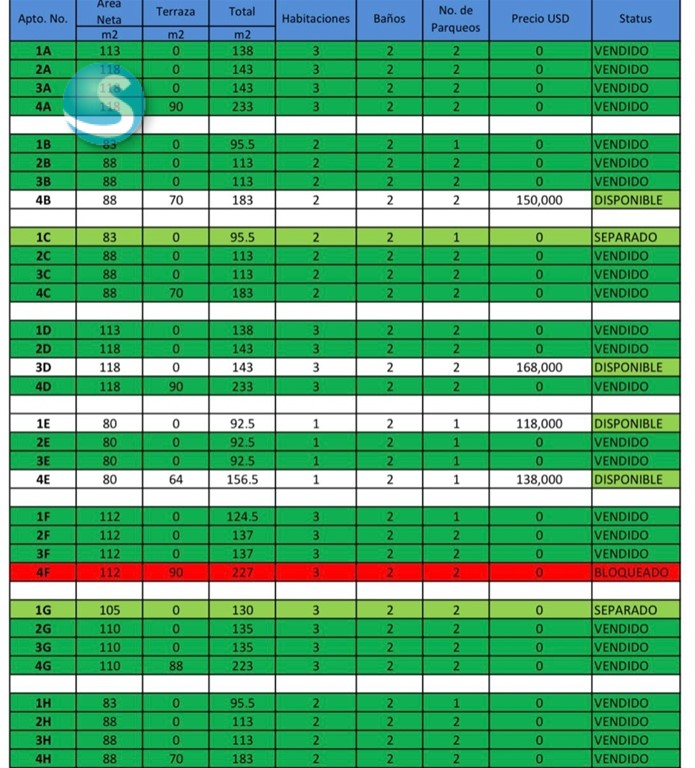 Proyecto de apartamentos de 2 y 3 habitaciones con control de de acceso, intercom, gas comun, pre instalacion de aires y calentador de agua que consta de las siguientes amenidades: Area Verde Gazebo con baños y vestidores Bar Area de juegos infantiles Piscina Caracteristicas generales: Terminacion de primera Pisos en porcelanato importado Tope de granito Puertas y closets de madera Ventanas corrediza en aluminio y vidrio DISPONIBILIDAD AL DIA 24 DE NOVIEMBRE: 4B 183 m2 con 70 de terraza de 2 hab y 2 baños con dos parqueos US$ 150,000 3D 118m2 neto 3 hab 2 b y 2 parqueos US$ 168,000 1E 80 m2 con 1H y dos baños 1 parqueo en 118,000 4E 80m2 neto y 64 de terraza 1 hab 2 baños y un parqueo en US$ 138,000