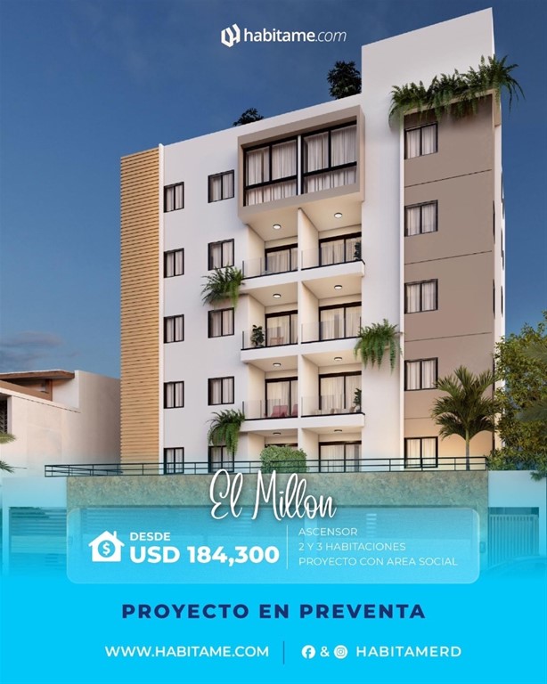 Proyecto en EL MILLON con cercania a las importantes avenidas 27 de febrero y nunez de caceres, situado estrategicamente con facil accesibilidad dentro de la zona metropolitana. zona privilegiada provista de centros comerciales, universidades, colegios, iglesias, clinicas, supermercados, diversos restaurantes, entre otros lugares de interes. Caracteristicas generales ? area social con bbq y kitchenette ? planta electrica full ? ascensor ultima generacion ? camaras de vigilancia ? intercom videoportero ? control de acceso y token ? sistema de pozo tubular?gas comun ? baño para conserje ? pre-instalacion a/a ? sistema contra incendios terminaciones generales ? cocinas modulares ? pisos en porcelanato importado ? revestimientos en ceramica importada ? puertas en madera preciosa con jambas topes de cocinas en granito natural?calentador a gas?techo en yeso TIPOS DE APARTAMENTOS Tipo A 132.60 mts Tipo B 93.33 mts TIPO PH A 187.94 mts TIPO PH B 158.38 mts FECHA DE ENTREGA Julio 2026 FORMA DE PAGO Reserva 5,000.00 USD 10% FIRMA DE CONTRATO 30% durante la construccion 60% contra entrega
